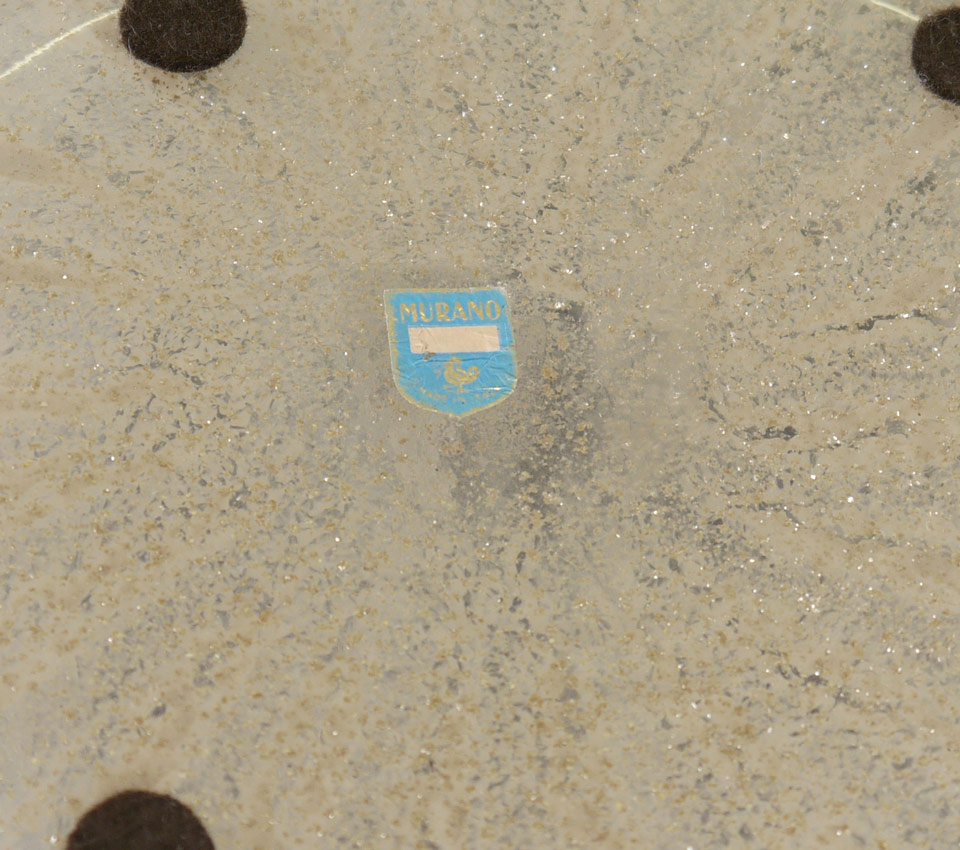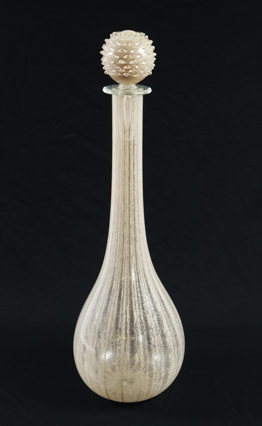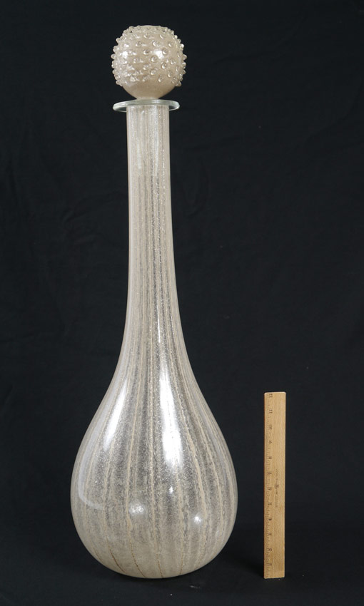 LARGE MURANO ART GLASS BOTTLE: With tan perpendicular lines, original foil label. Sold with large glass studded stopper that may be replacement. Overall 34 3/4'' h. x 11 1/2'' dia.