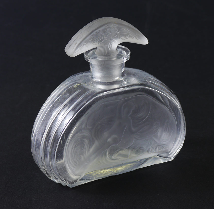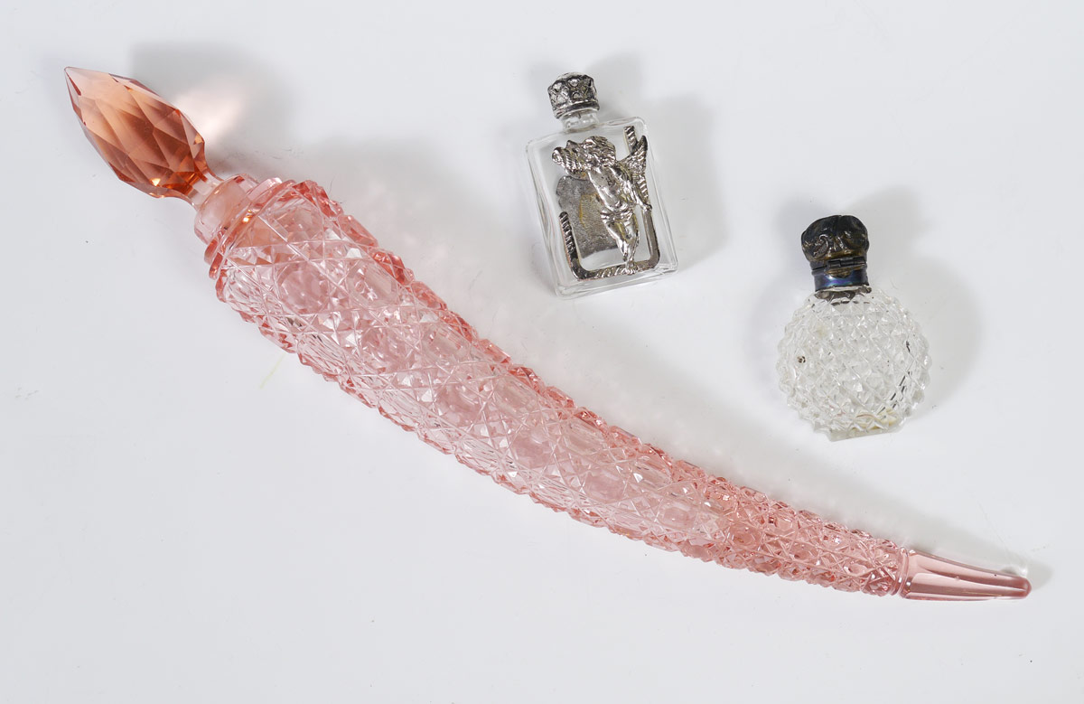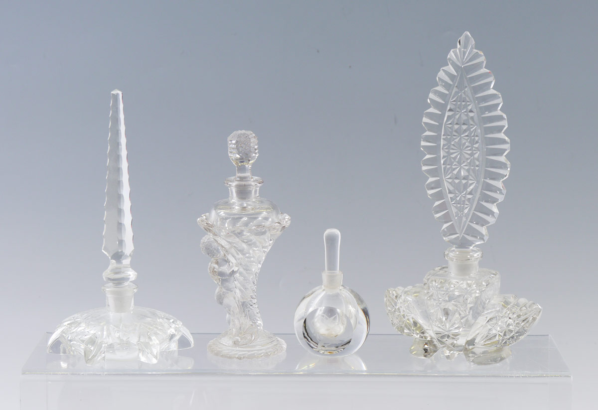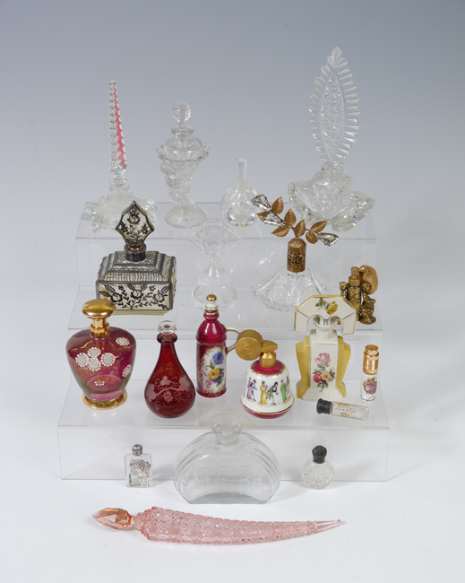 18 PIECE COLLECTION OF PERFUME BOTTLES: An assembled collection to include metal mounted, cut glass, etched, cut to clear, porcelain and figural bottles. Includes a Melba embossed glass bottle, 5'' h. x 5 1/8''.