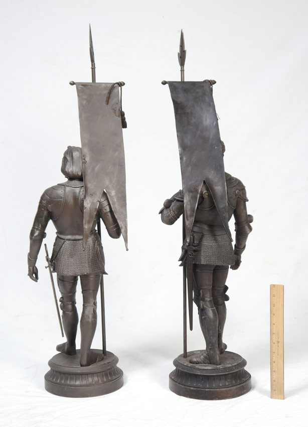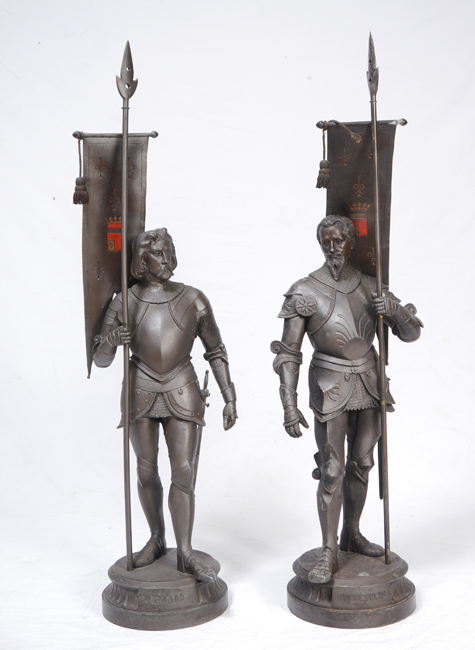 PAIR SPELTER FRENCH CHEVALIER SOLDIER FIGURES: Figures of famous French knights Du Guesclin and Bayard. Each holding spear and banner, 39 3/4'' h. x 10 1/4''.