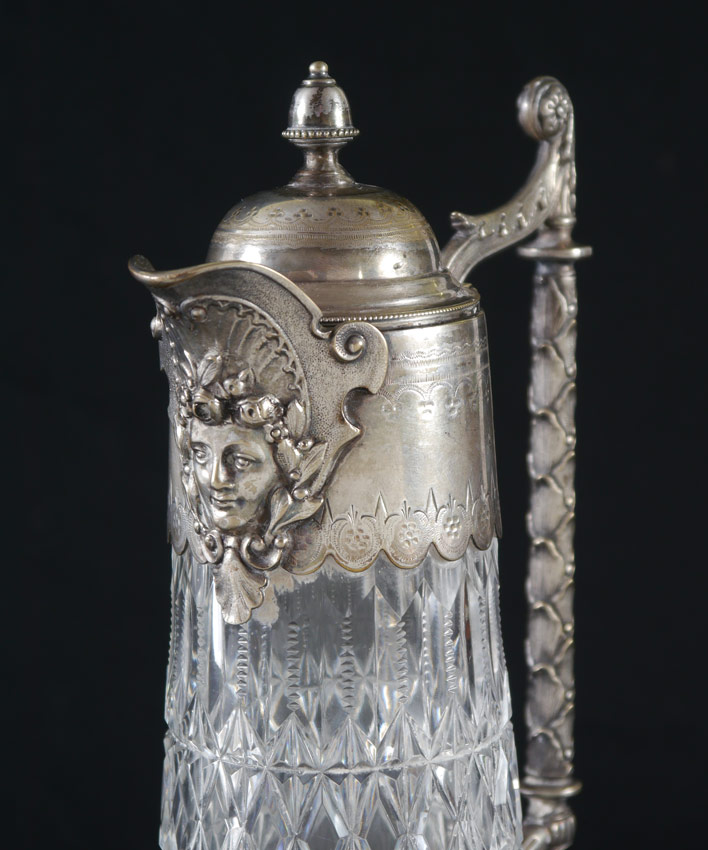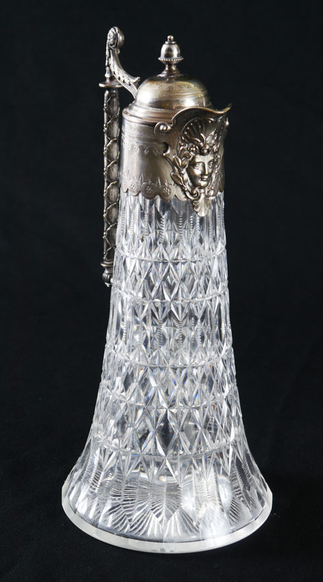 METAL MOUNTED CUT GLASS CLARET JUG: Hinged lid, masqueron pour spout, decorative handle, cut glass body. Measures 12 1/4'' h. x 6''.
