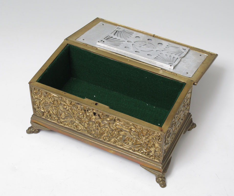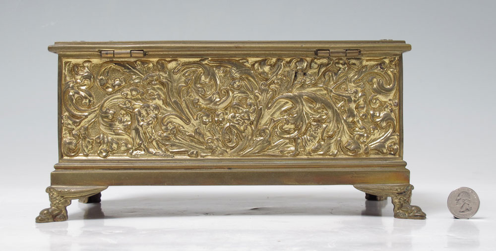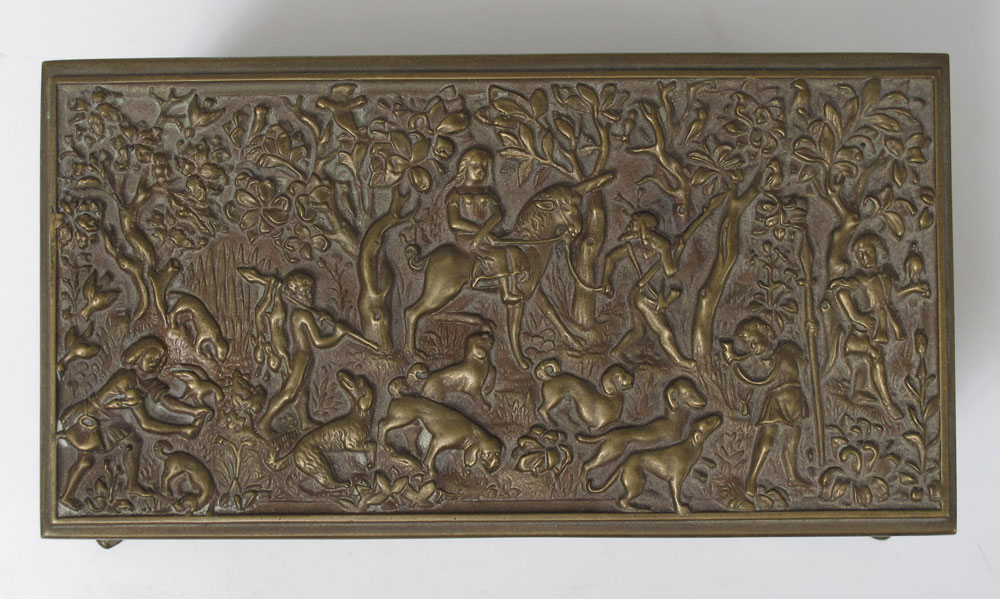 EMBOSSED HEAVY BRASS / BRONZE? HUMIDOR HINGED TOP BOX: Mythological hunt scene on hinged top with other mythological scenes on sides, on 4 feet. Later green felt lining. Measures 5 1/2'' x 11 1/2'' X 6 1/2''.