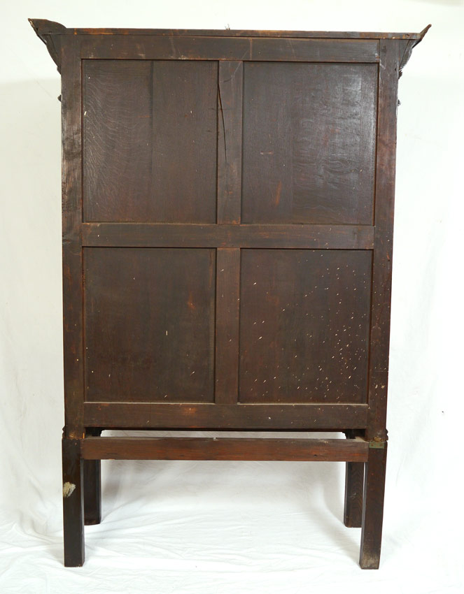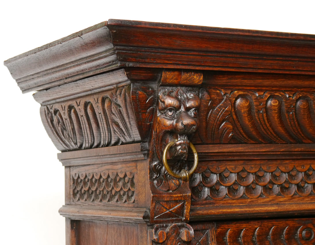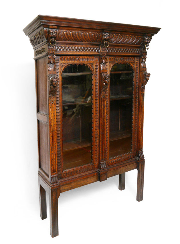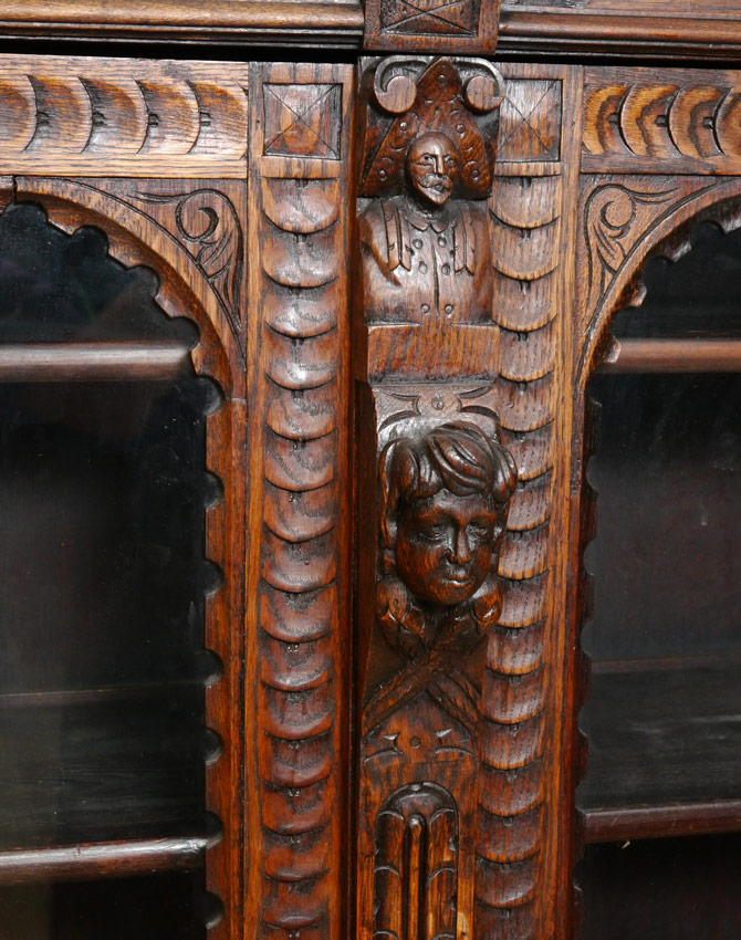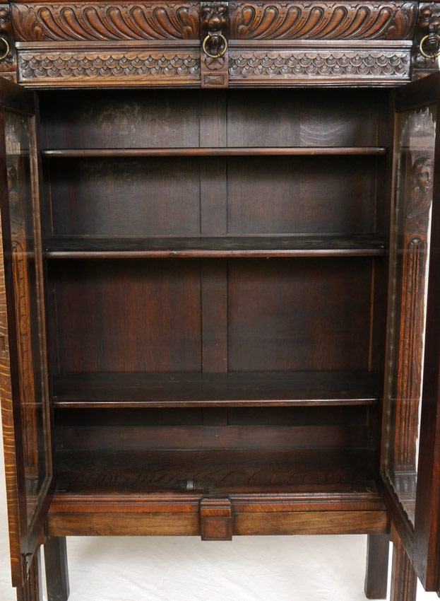 HEAVILY CARVED OAK BOOKCASE ON STAND: Profusely carved with lions, military busts and winged maiden masquerons. Additional fish scale and foliate motifs as well. Top with 2 doors and 3 shelves, on stand. Overall 71 1/2'' h. x 50 1/4'' x 15 1/2''.