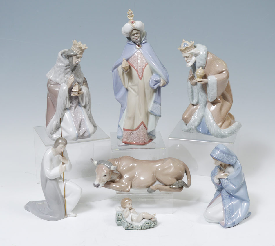 LLADRO PORCELAIN NATIVITY SET: Glazed figures by Juan Huerta sculptor, issued 1988, to include, 1) MARY #5477, 7 1/4''; 2) BABY JESUS #5478, 2''h.; 3) KING MELCHOIR #5479, 9''h.; 4) KING GASPAR #5480, 9''h.; 5) KING BALTHASAR #5481, 12''.; and 6) OX #5482, 2 3/4'' x 8'' Sold with 7) JOSEPH #4533, Fulgencio Garcia sculptor, issued 1969, 7 5/8''h. as a lot.