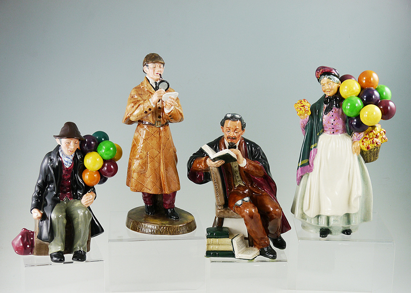 4 ROYAL DOULTON FIGURINES: To include, 1) BIDDY PENNYFARTHING, HN 1843, 9''h.; 2) THE DETECTIVE, HN 2359, 9 1/2''h; 3) THE PROFESSOR, HN 2281, 7 1/2''; and 4) THE BALLOON MAN, HN 1954, 7''h. Sold as a lot.