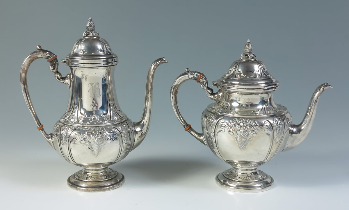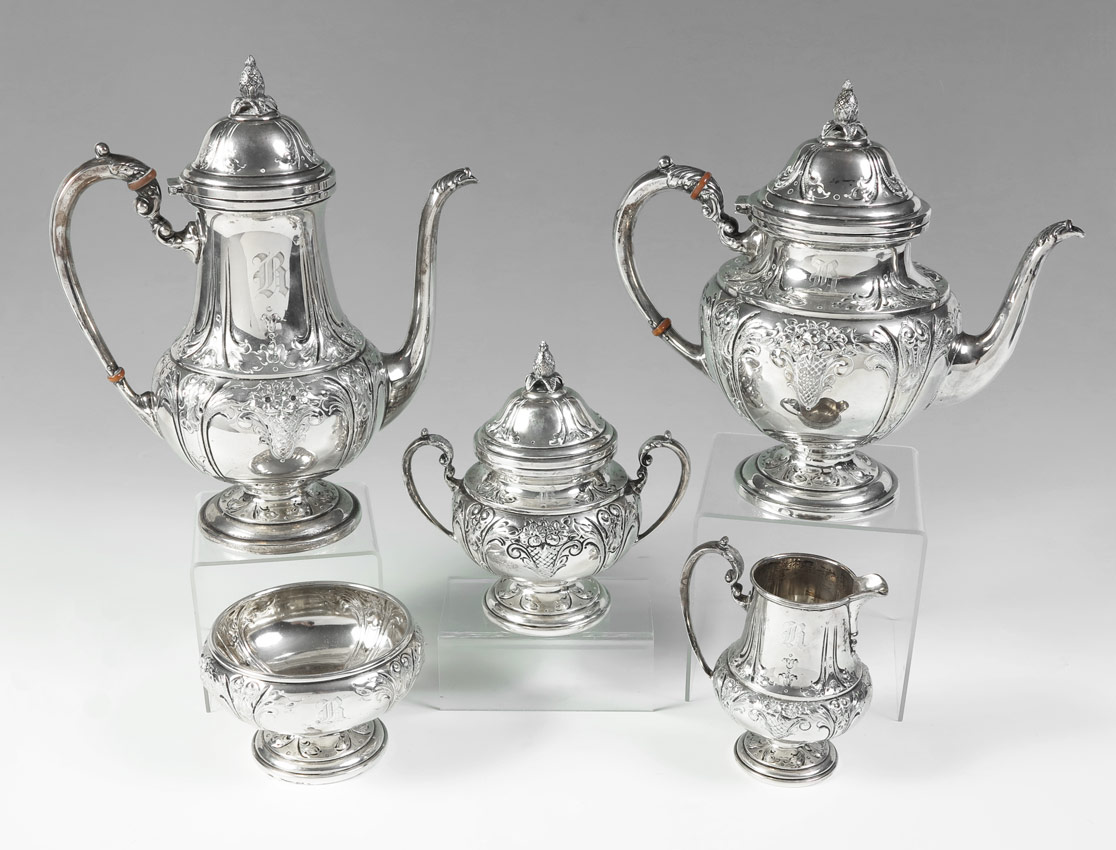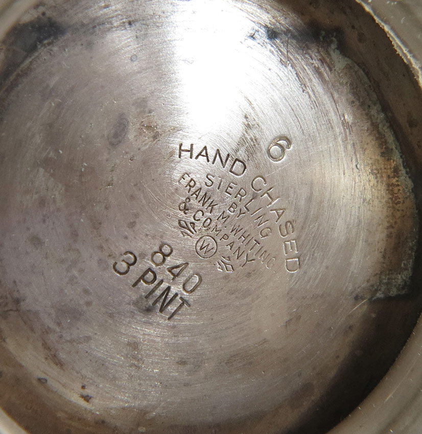 5 PIECE WHITING HAND CHASED STERLING TEA SERVICE: 5 pieces total by Frank M. Whiting, hand chased, each piece marked with pattern number 840. To include 1) Coffee pot with hinged lid, pineapple finial, 11'' h. x 9 1/2''. 2) Teapot with hinged lid, pineapple finial, 9 1/2'' h. x 10 1/4''. 3) Covered sugar, 6 3/4'' h. x 6 1/2''. 4) Open creamer, 5 1/4'' h. x 4 1/2''. 5) Open waste bowl, 3 1/4'' h. x 5''. Each piece monogrammed ''R''. Approx. 80 troy oz.