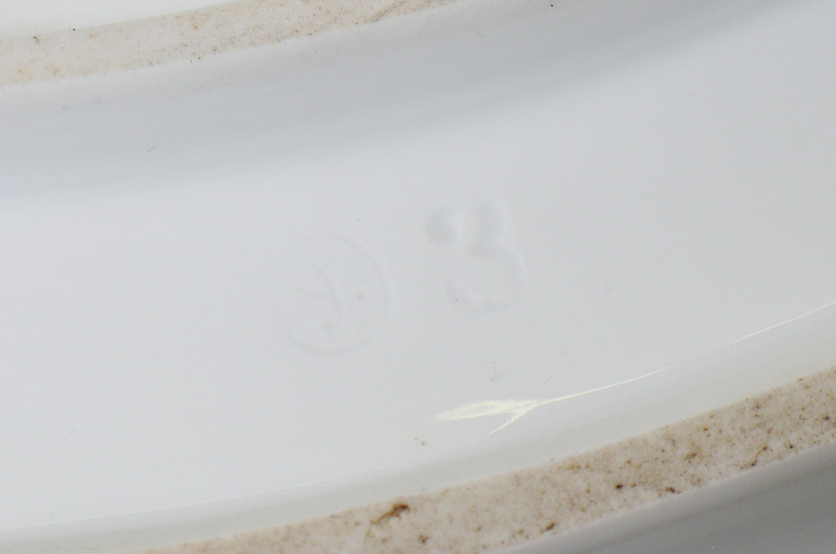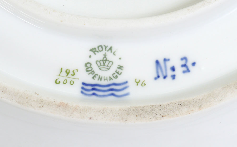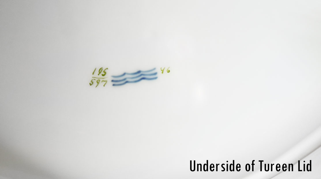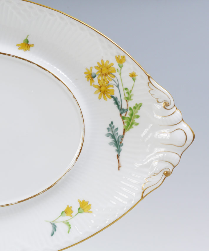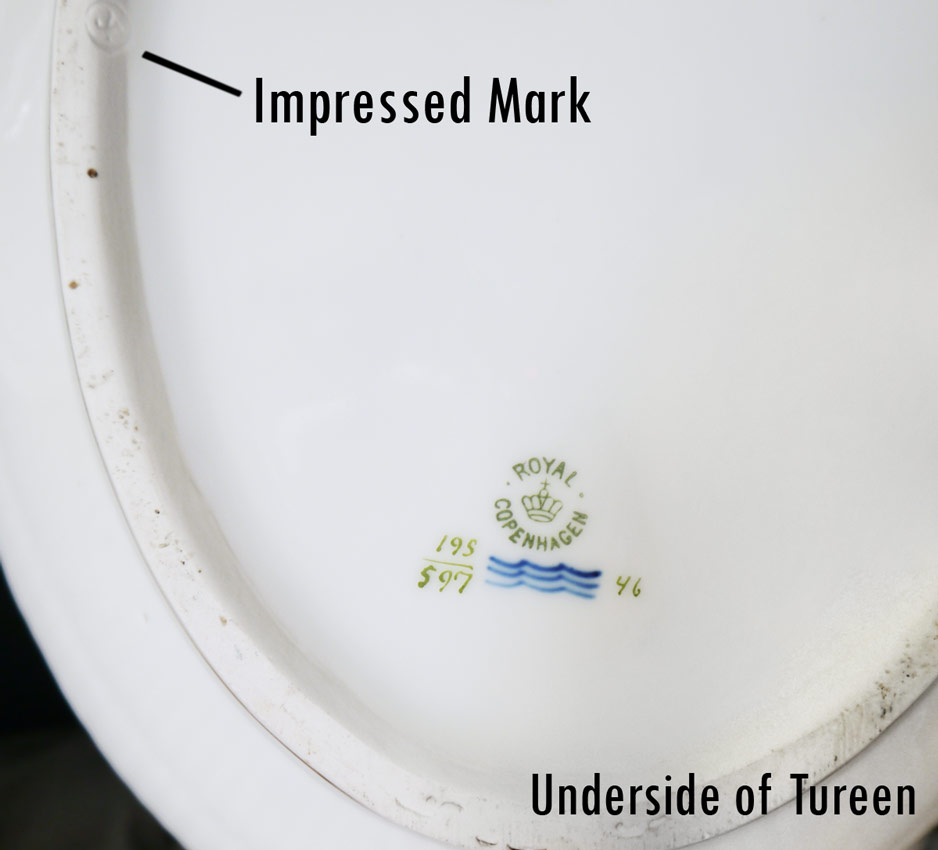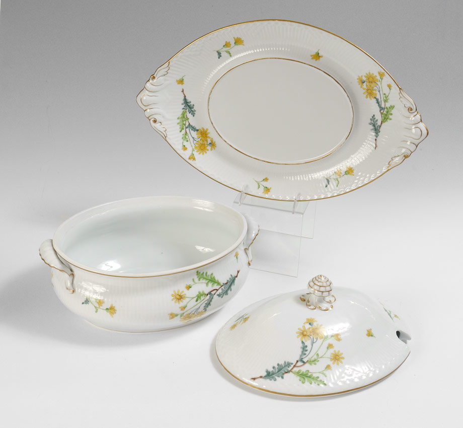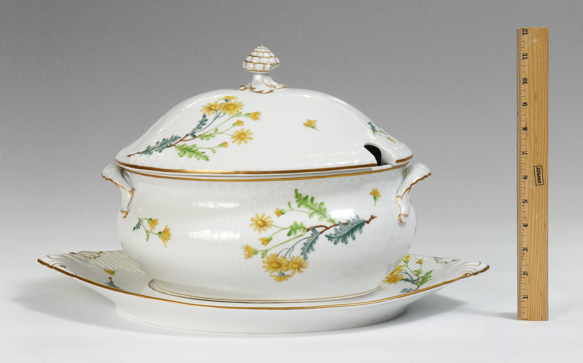 ROYAL COPENHAGEN FLORA DECORATED CHINA TUREEN AND UNDERPLATE: The tureen 195/597, 14''l. Underplate 195/600, 19 3/4''l.