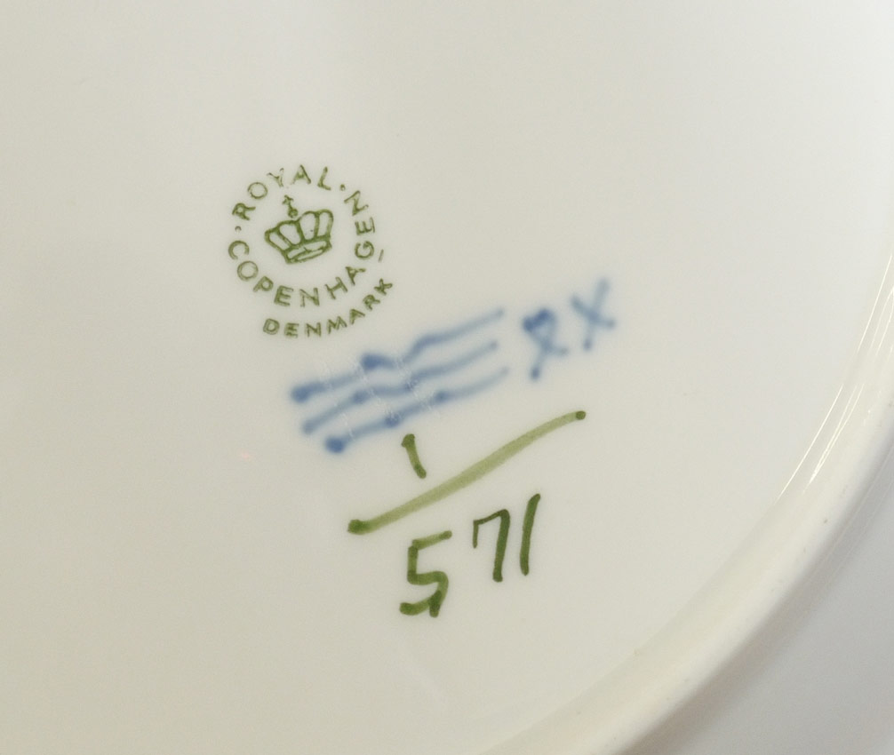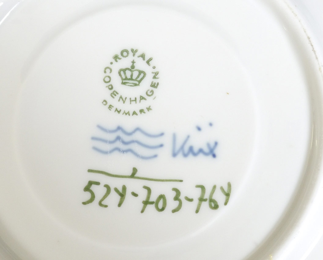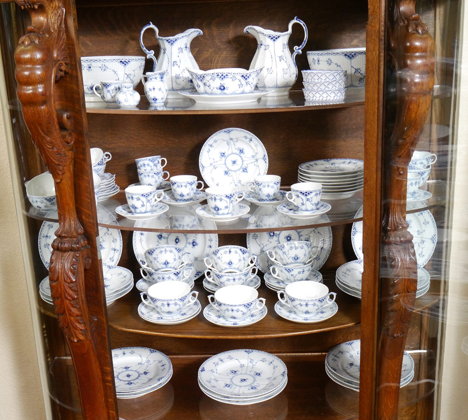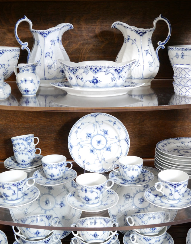 ROYAL COPENHAGEN BLUE FLUTED CHINA HALF LACE: Approx. 91 pieces to include 19 dinner plates 511, 8 salad plates 513 (chip), 9 cream soups 764, 11 cream soup saucers, 2 salad serving bowls 631, mustard 744 (no lid, gravy boat with attached underplate 587, a pair of 32 oz. pitchers 646, a mini cream jug 521, round vegetable bowl 512, small salt shaker, 20 assorted cups, 8 saucers, and 7 scalloped saucers.