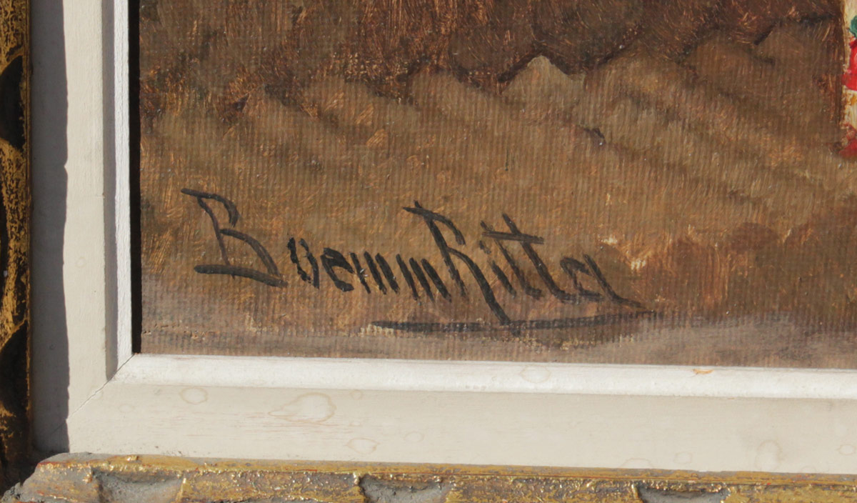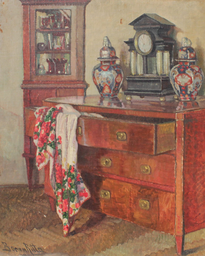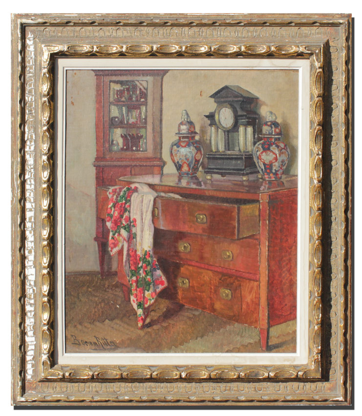 BOEMM, Ritta, (Hungarian, 1868-1948): Bedroom Interior Scene with Chest of Drawers, Imari Vessels, Mantle Clock, and Corner Cupboard, Oil/Canvas laid on board, 24'' x 20'', signed lower left, encased in worn gilded gesso frame 33'' x 28 1/2''.