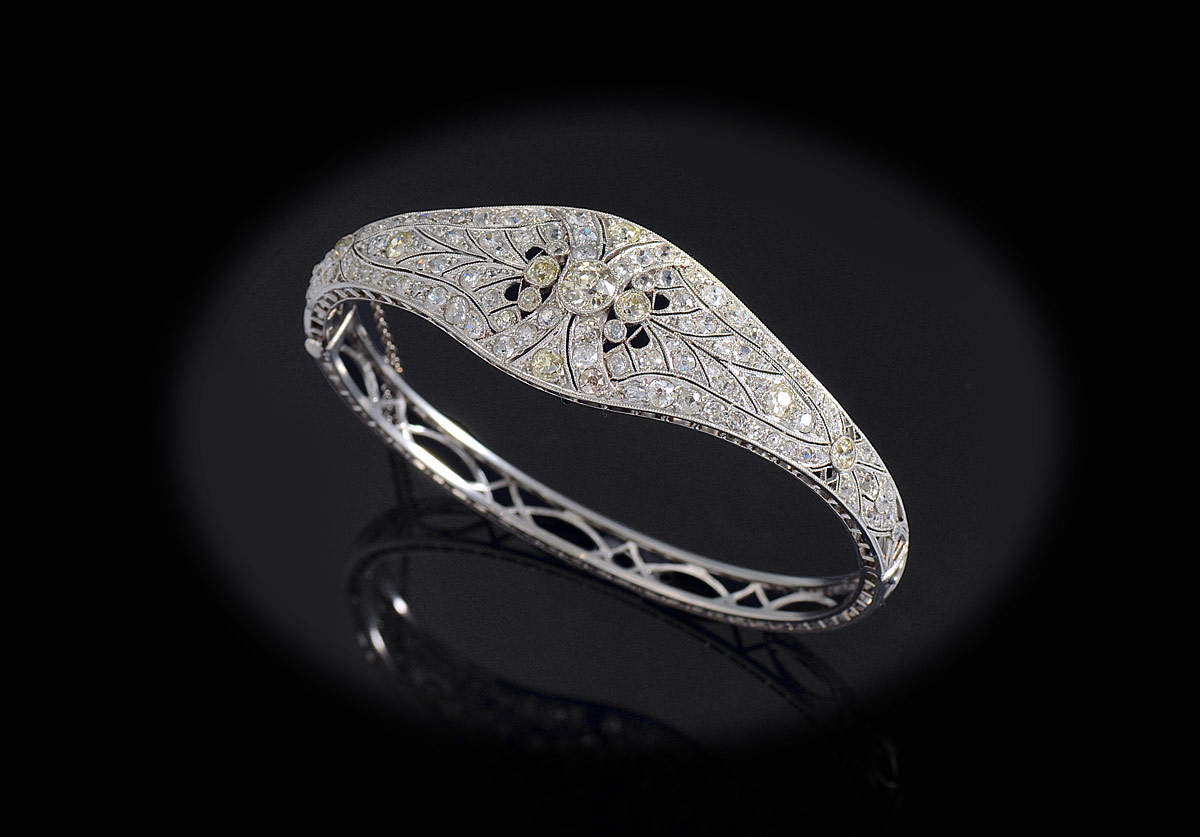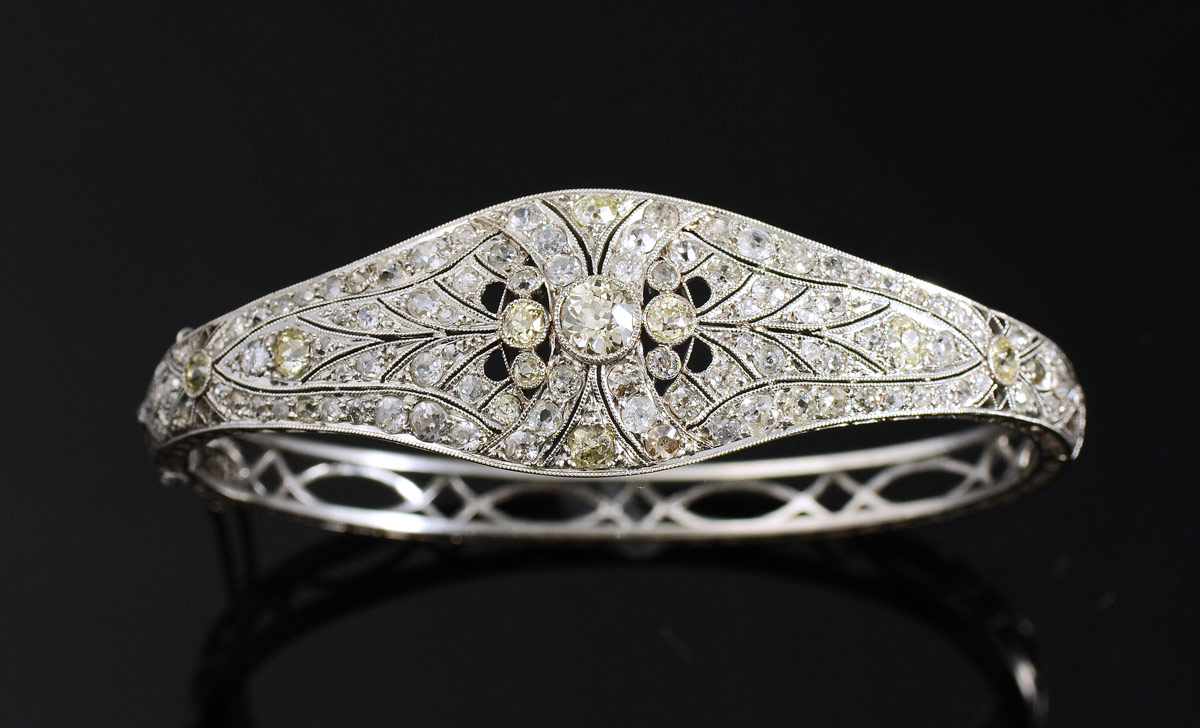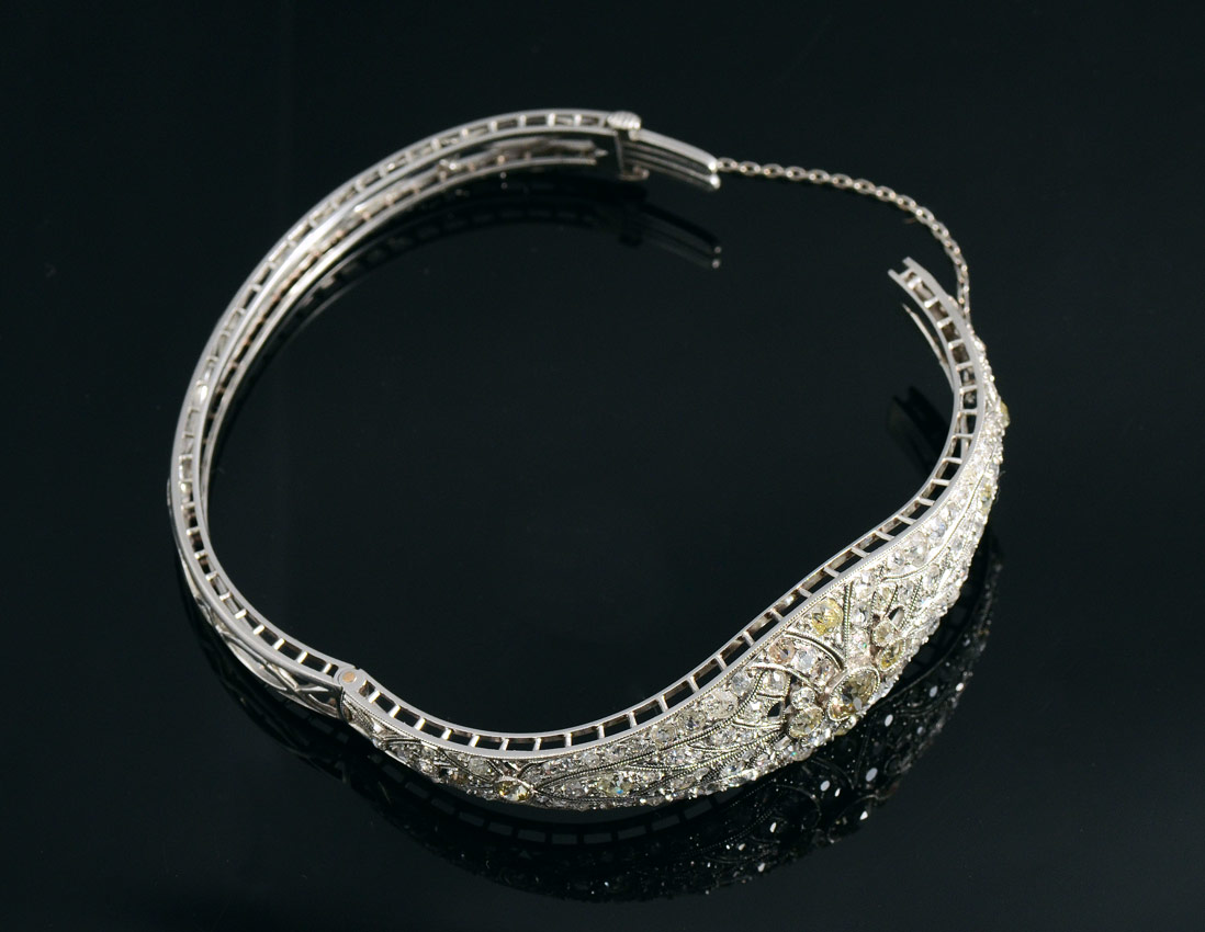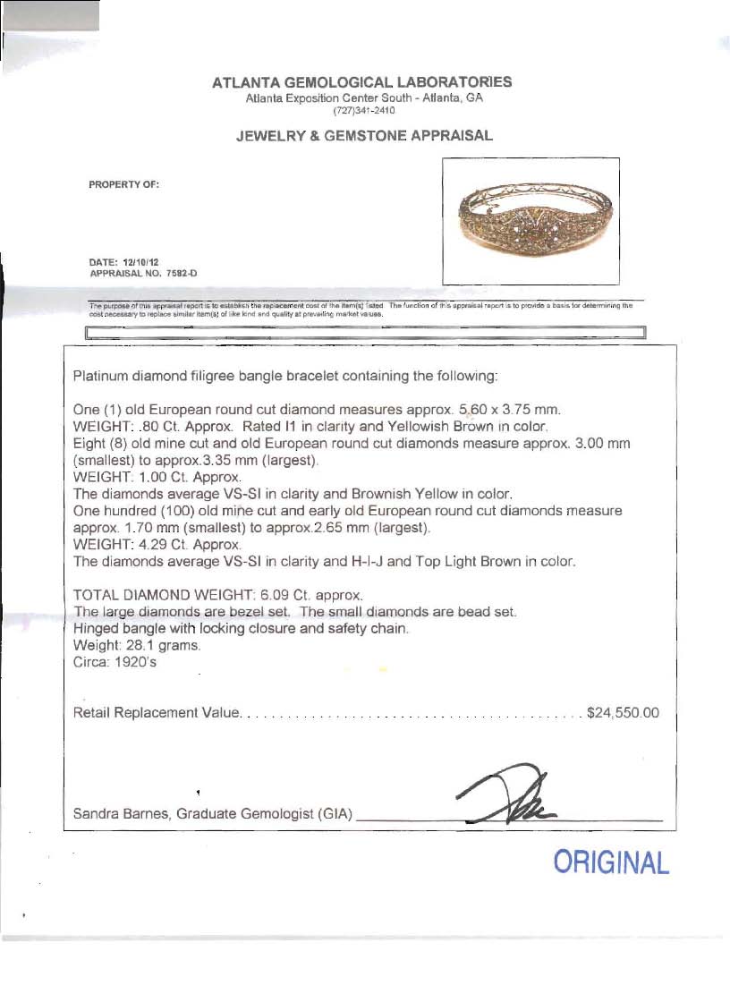 THE 1920's PLATINUM DIAMOND BANGLE BRACELET: Centering an approx. .80 Ct old European round cut diamond and 1 Ct of old mine and old European cut diamonds. An additional 100 old mine cut diamonds total approx. 4.29 Ct. TOTAL diamond weight approx. 6.09 Ct. All diamonds ar H-I-J to top light brown in color. Hinged bangle with locking closure and safety chain. Weight 28.1 grams. Sold with current Atlanta Gemological GIA graduates appraisal for $24,550.