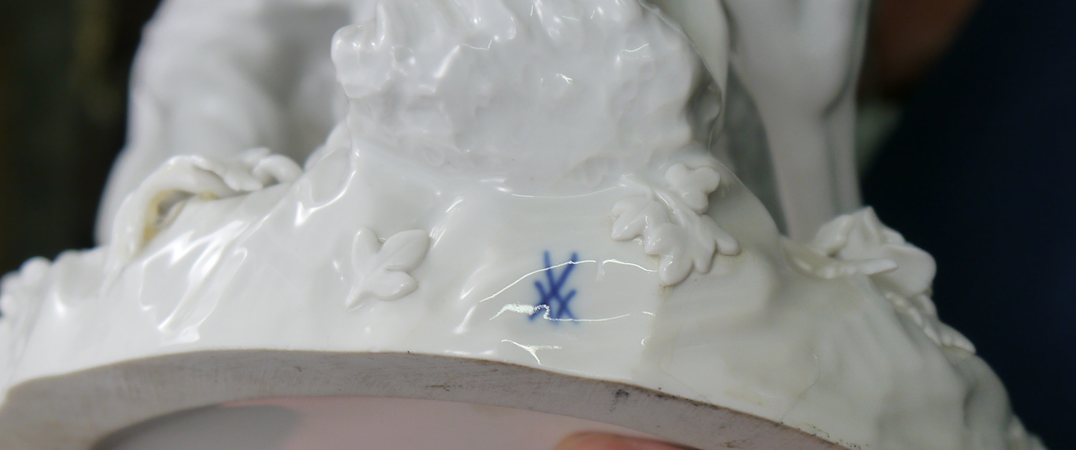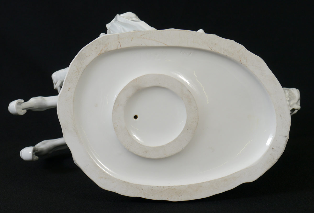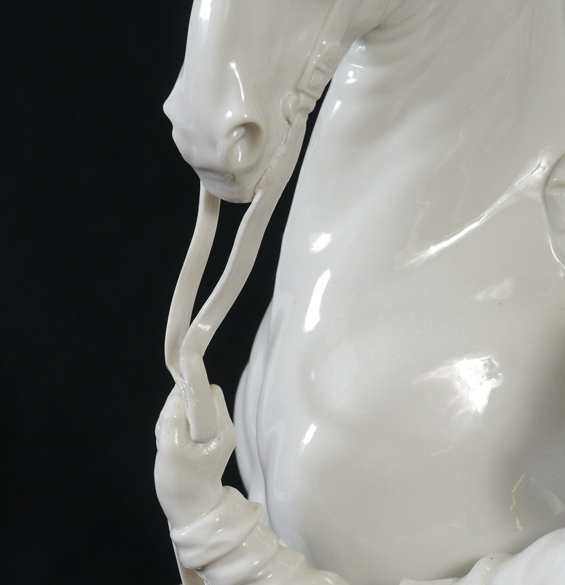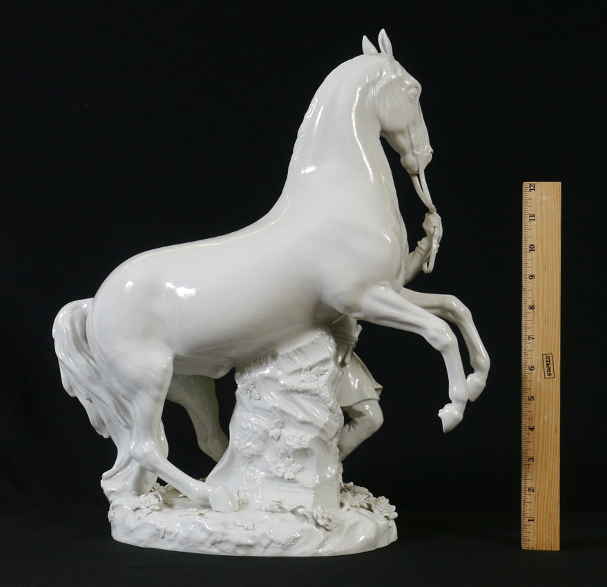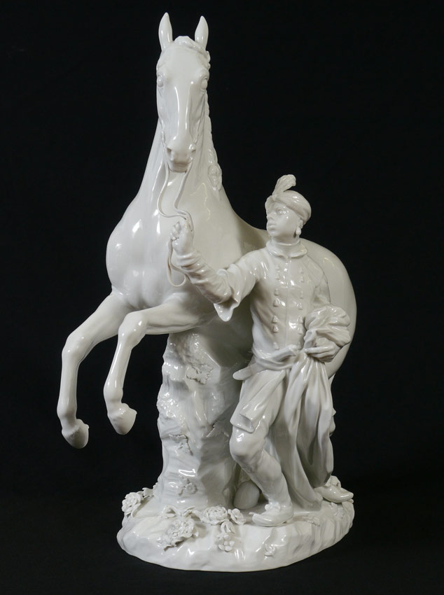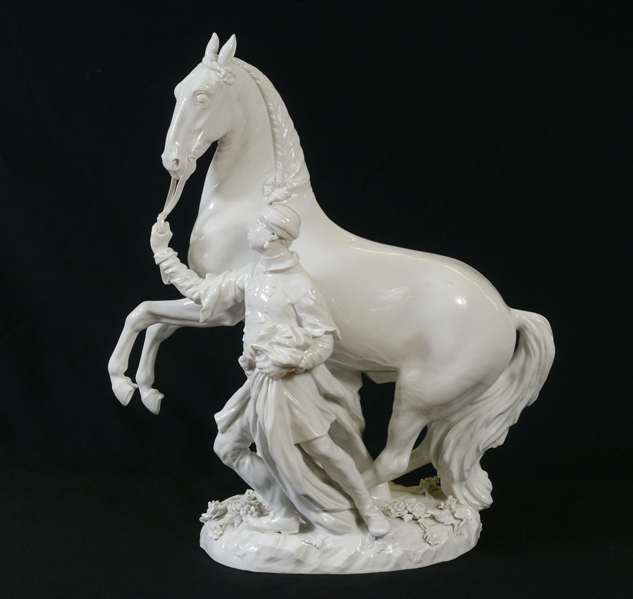 MEISSEN LARGE BLANC DE CHINE PORCELAIN BLACKAMOOR & HORSE: Figure of a large horse with blackamoor handler. Blue under glaze cross sword mark. Measures 15 1/2'' h. x 15'' x 7 1/2''.
