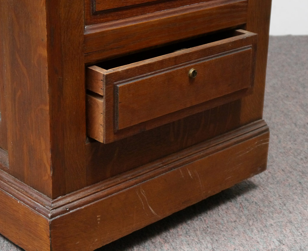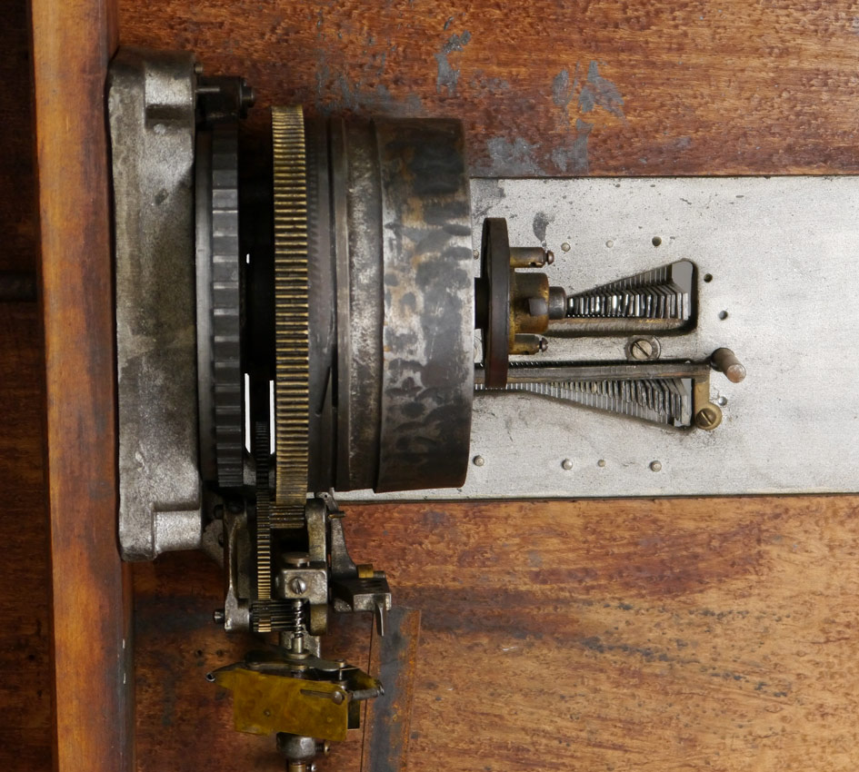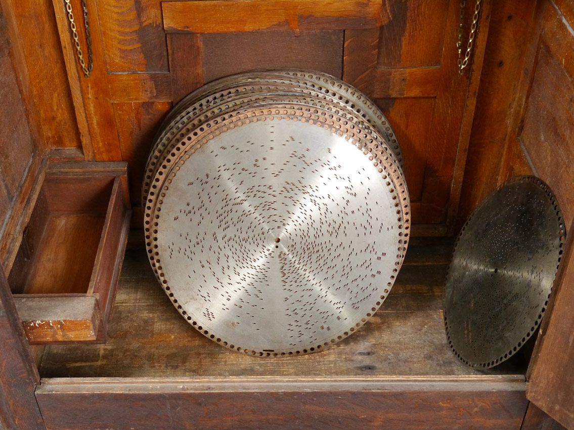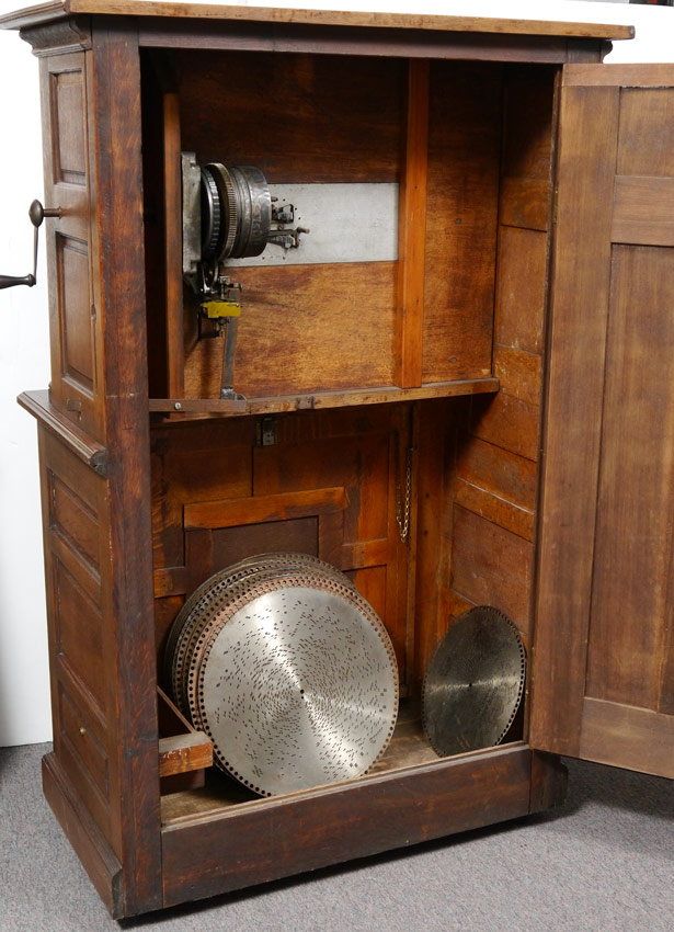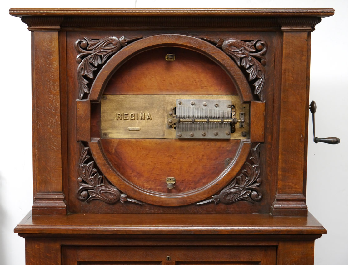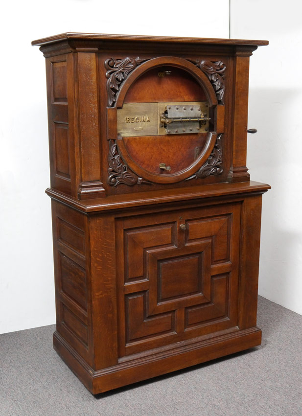 CARVED OAK REGINA UPRIGHT DISC PLAYING MUSIC BOX: Unusual oak case with carved & pierced decoration framing front bezel. Geometric carved lower door. Regina marked double comb, plays 15 1/2'' discs. Sold with approx. 44 discs plus a 12 1/4'' disc. Keys in office. Measures 55 1/2'' h. x 34 1/2'' x 18''.