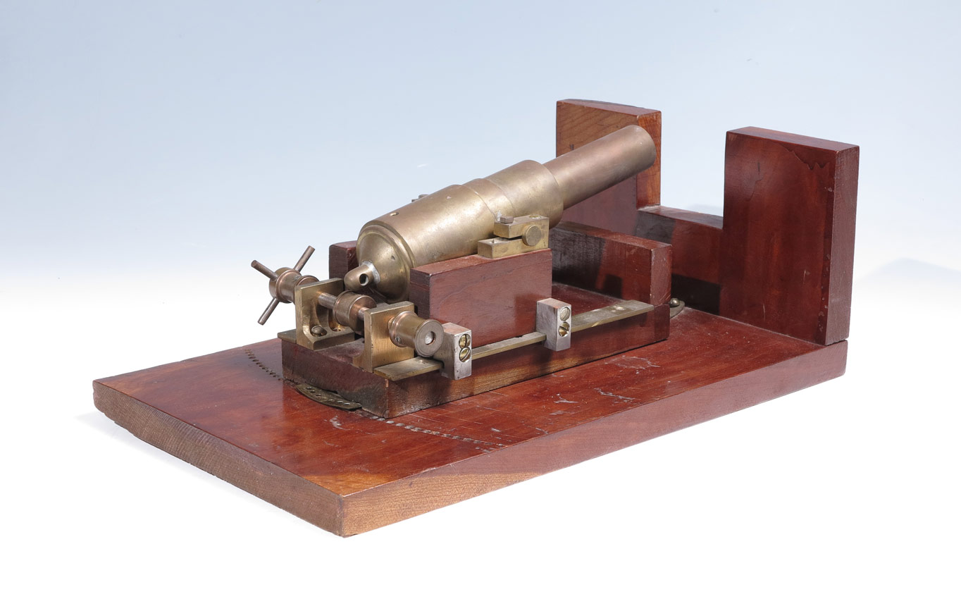 BRONZE SIGNAL CANNON: Early 20th century signal cannon on wood base. Has unique features including crank to change elevation and movable base to change direction of fire. Barrel also slides forward and back on track. Unmarked as to maker. 9'' barrel, overall 6'' h. x 16 1/2'' x 10''.