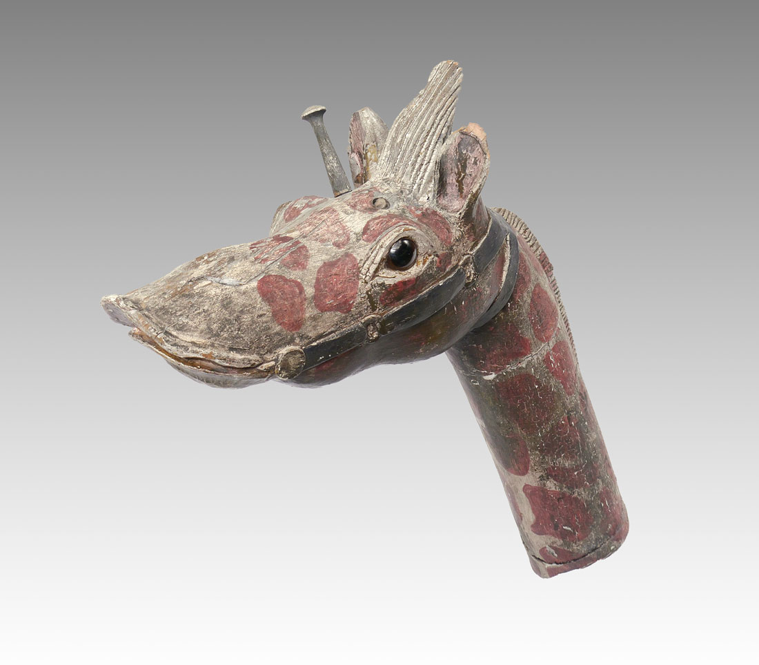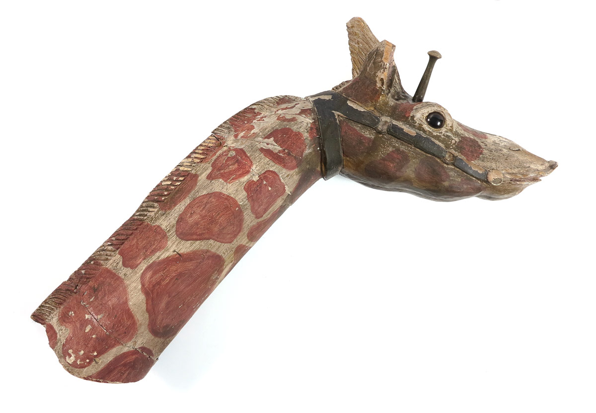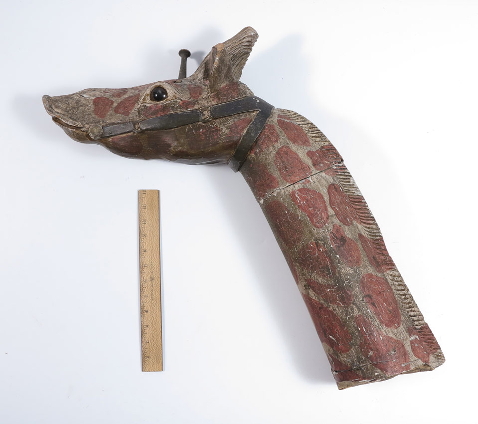 CARVED CAROUSEL GIRAFFE HEAD: Early to mid 20th century, carver unknown. Glass eyes. Overall 30'' l. x 13'' x 6 1/2''.