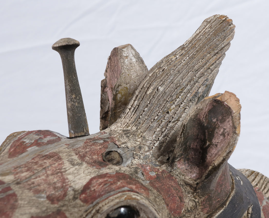 CONDITION: Loss of paint decorations, loss of one horn, chips to ears, age cracks to neck.