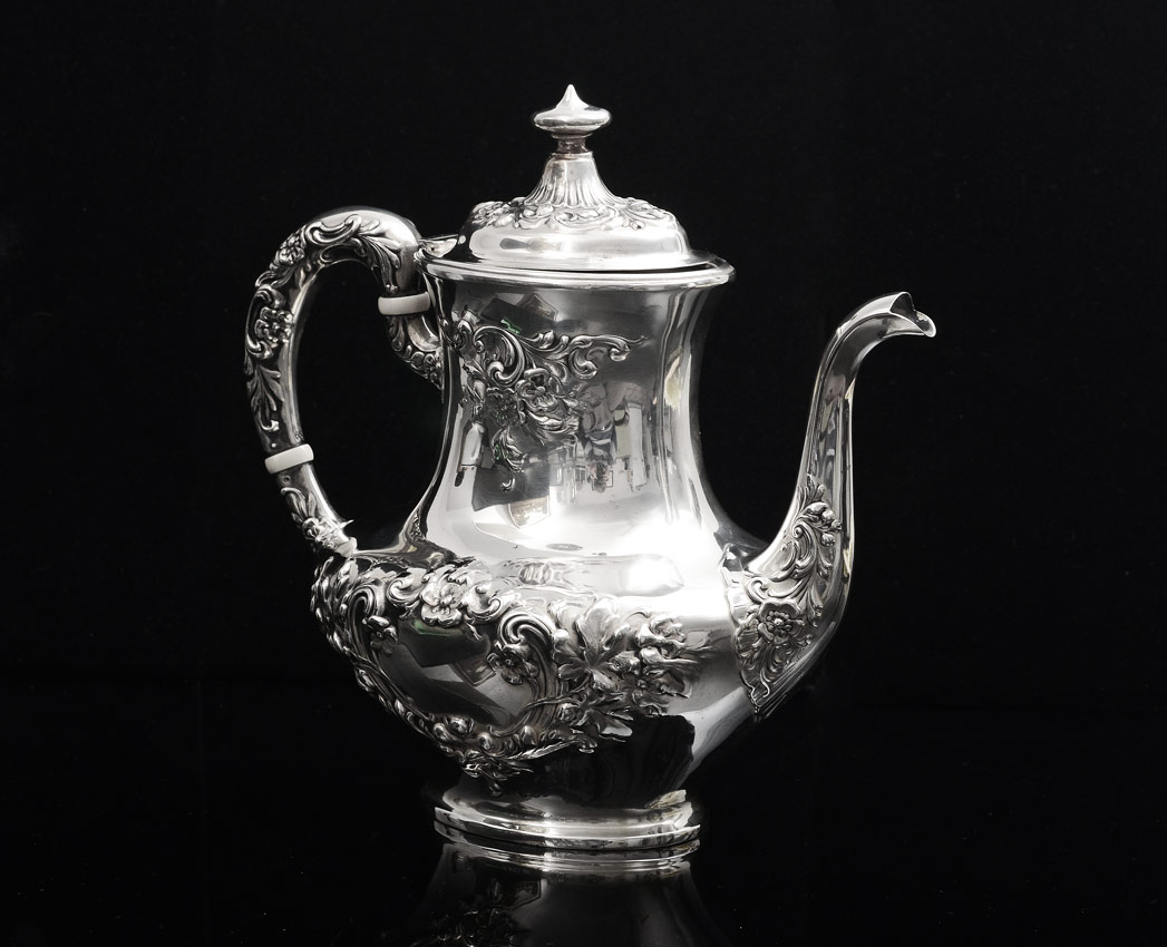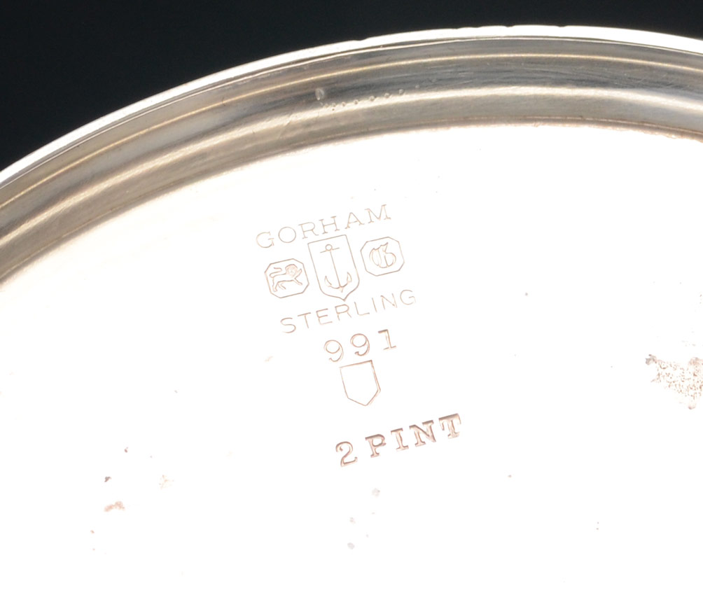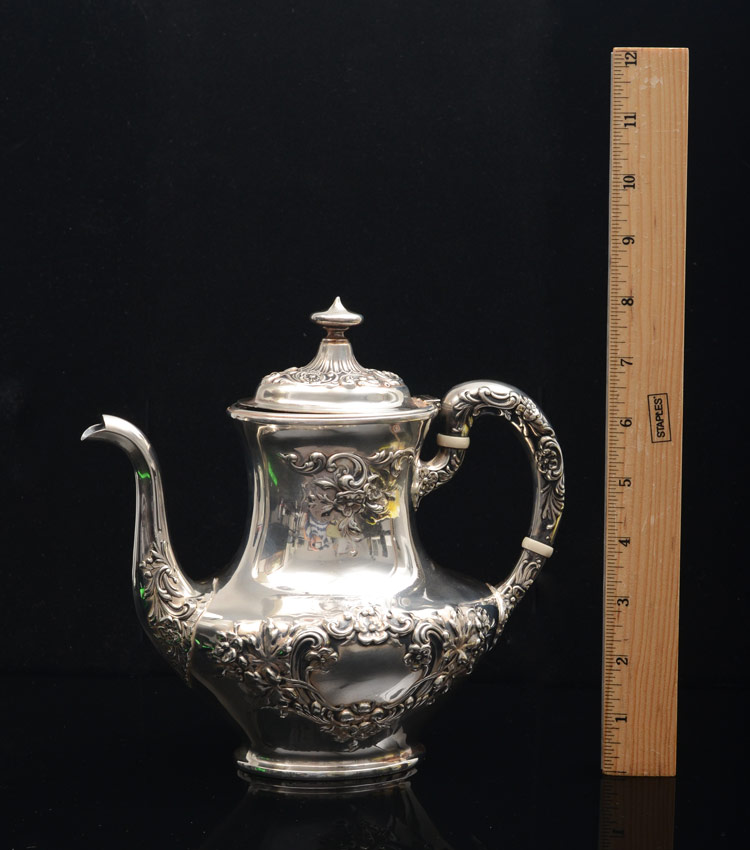 GORHAM REPOUSSE STERLING TEA POT: Circa 1950's floral motif repousse design, hinged lid. Marked Gorham Sterling 990 2 pint. Measures 7 3/4'' h. x 8 1/2''. Approx. 16.2 troy oz.