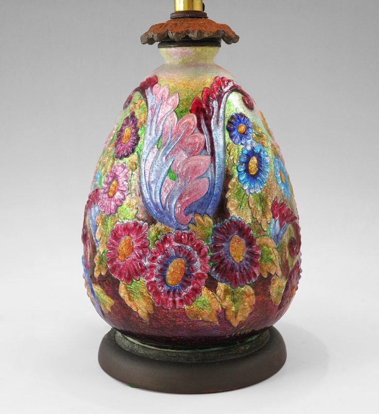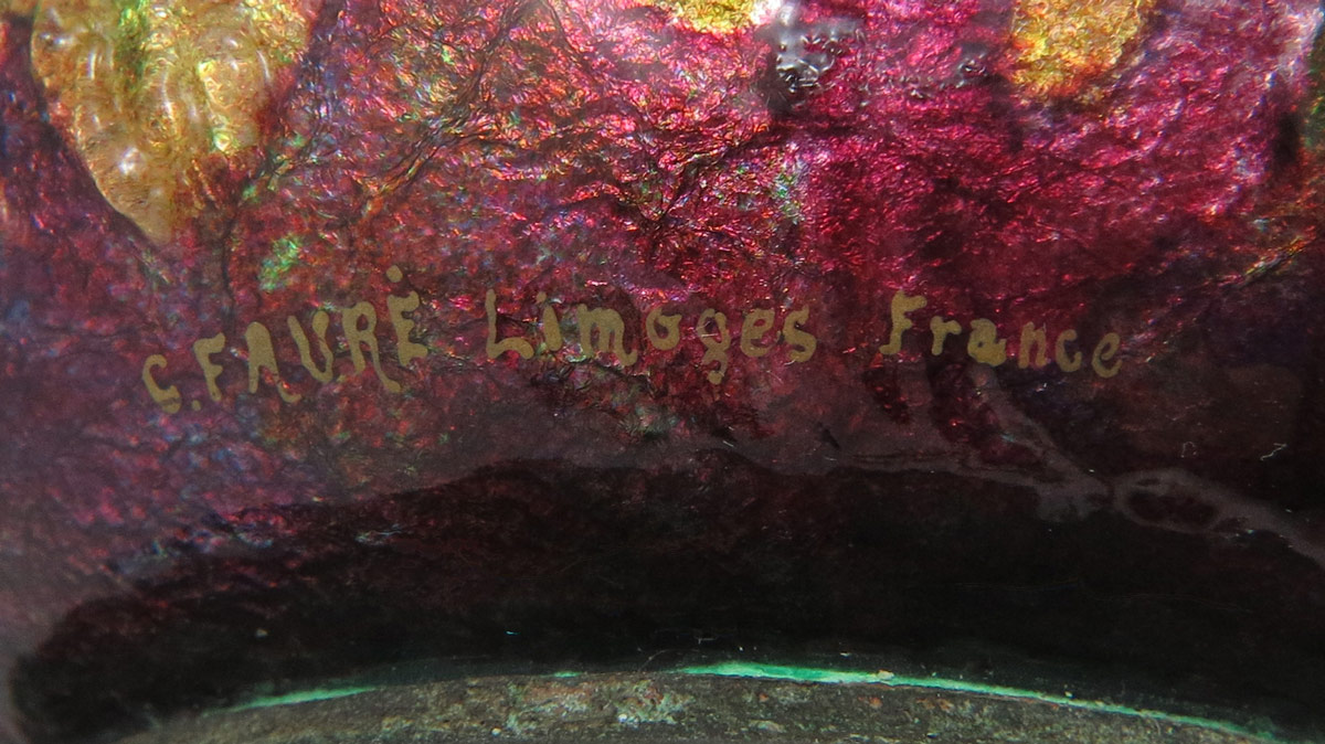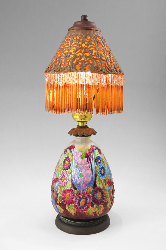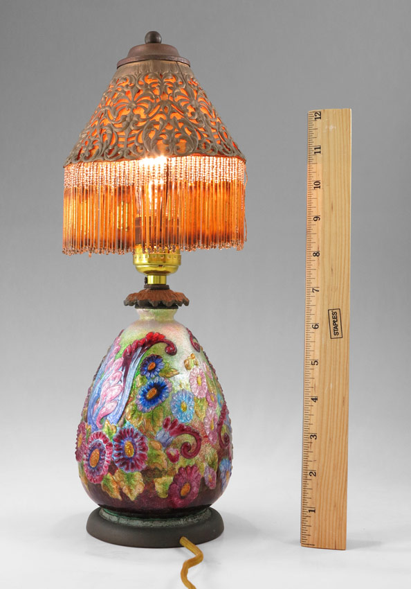 CAMILLE FAURE FRENCH ENAMEL LAMP: Limoges, France. Art Deco enamel on metal in a technique rich in texture built on layers. Signed ''C. Faure Limoges France''. Pierced brass shade with glass bead fringe. Lamp measures 14 1/2'' tall. Enamel body is approx. 6''.