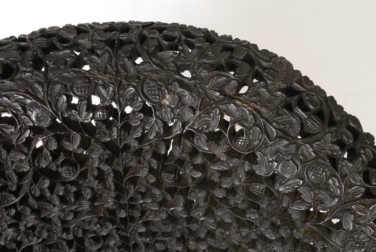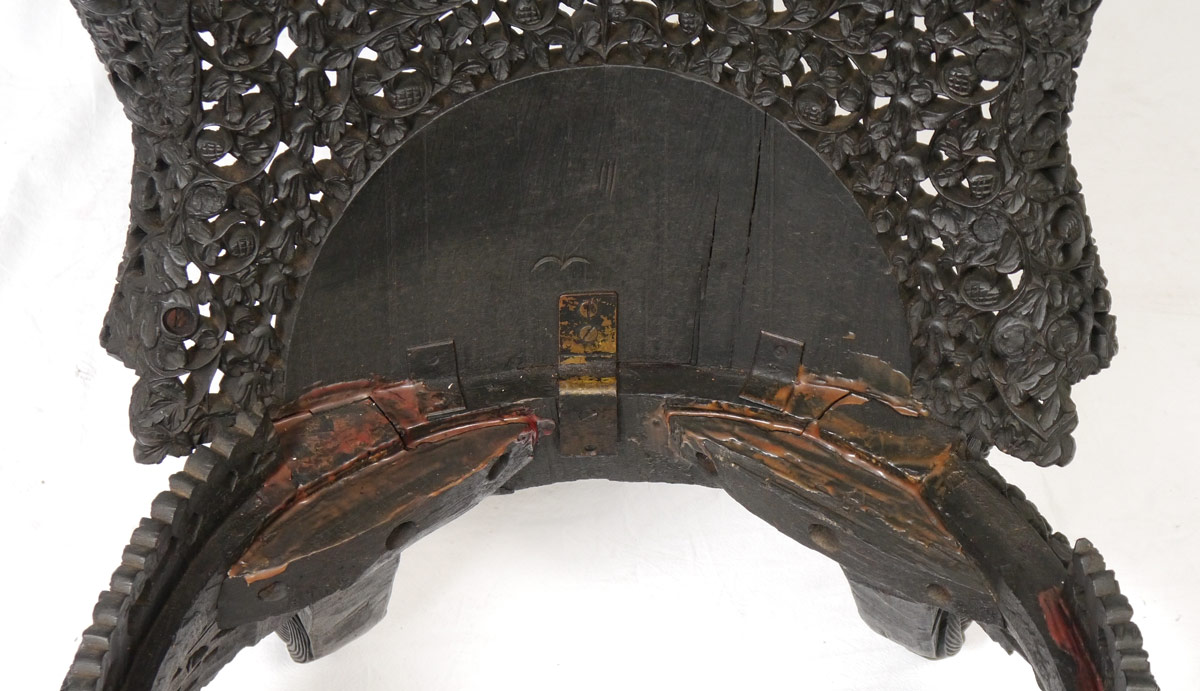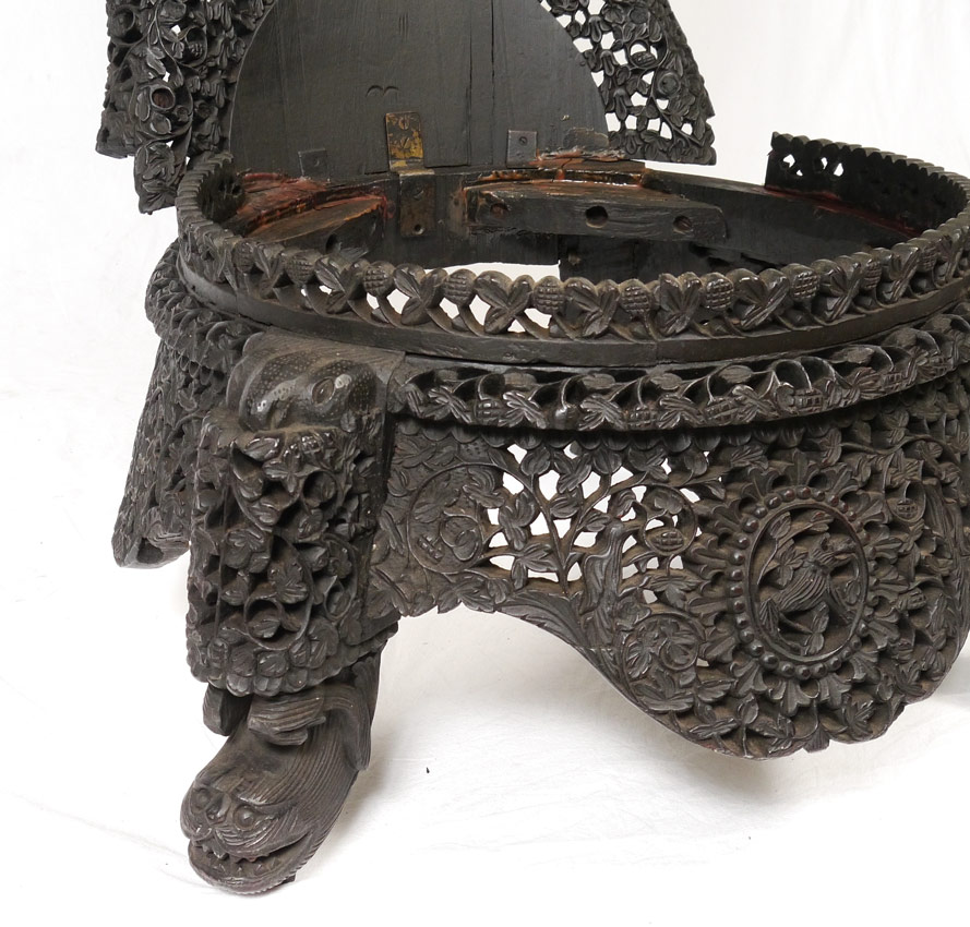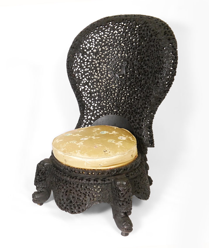 ORNATELY CARVED BURMESE PARLOR CHAIR: Extensive and finely detail pierce work carving all over with floral motifs and central medallions, carved and shaped figural feet. Cushion with rose motif fabric. Overall measures 36 1/4'' h. x 22 1/4'' x 30''.