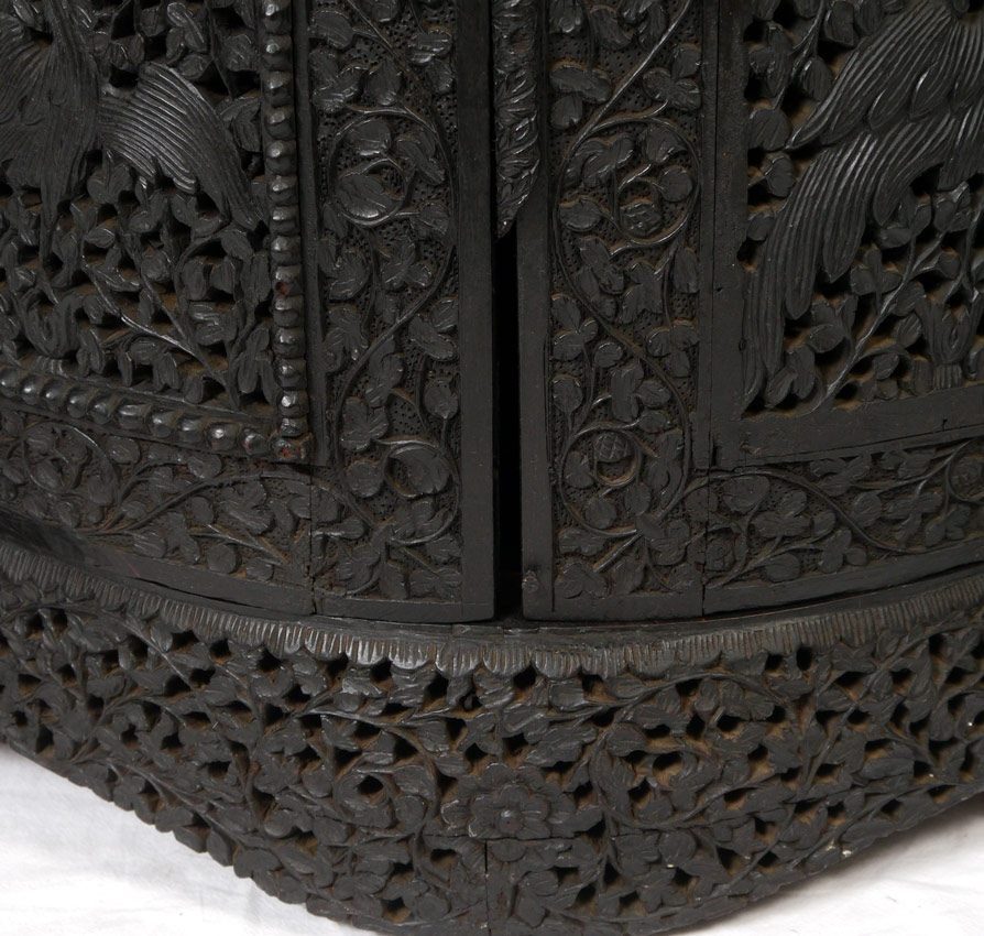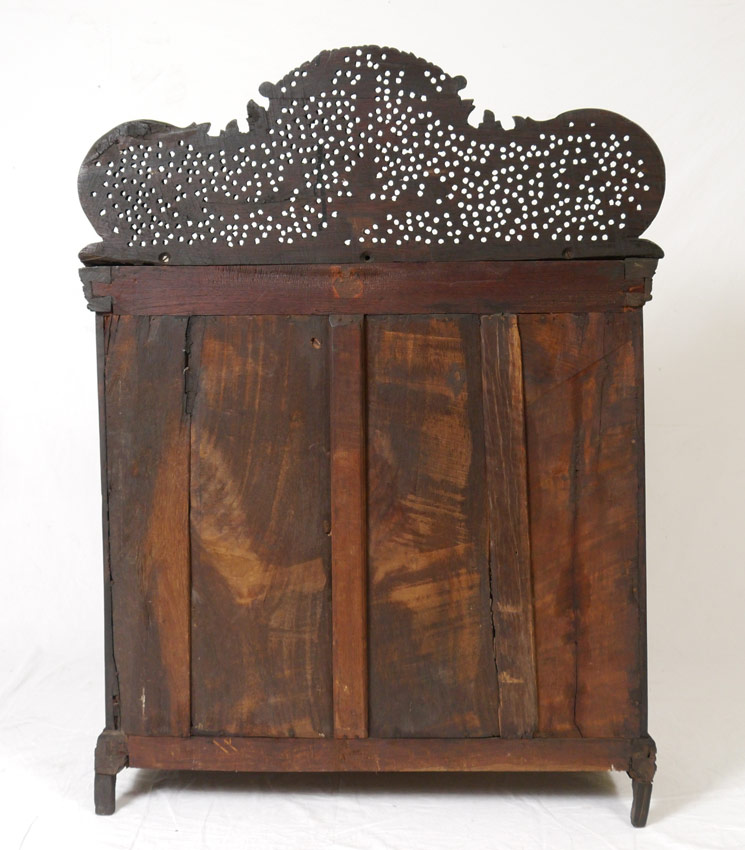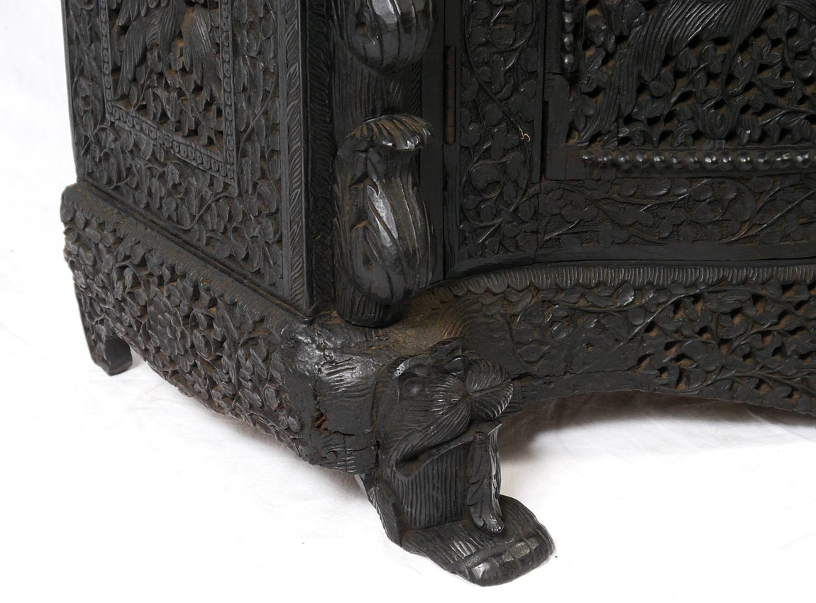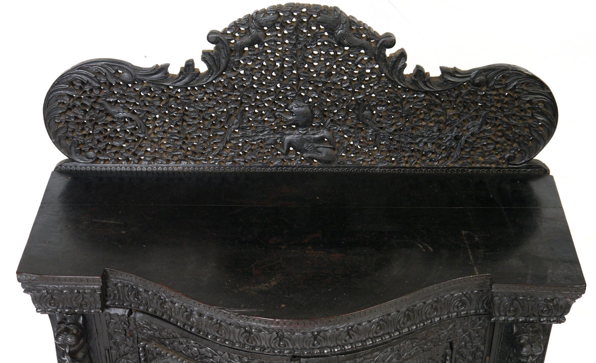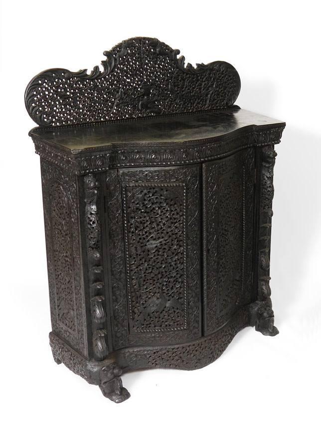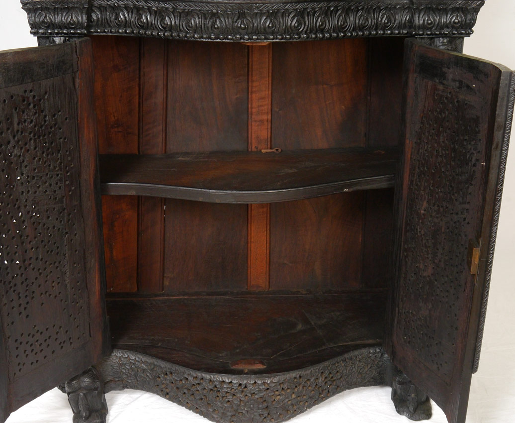 ORNATELY CARVED BURMESE CABINET: Extensive and finely detail pierce work carving all over, 2 doors with single interior shelf. Carved figural stiles and feet. Overall measures 42'' h. x 31 1/2'' x 14 1/2''.