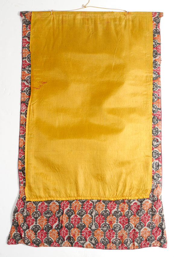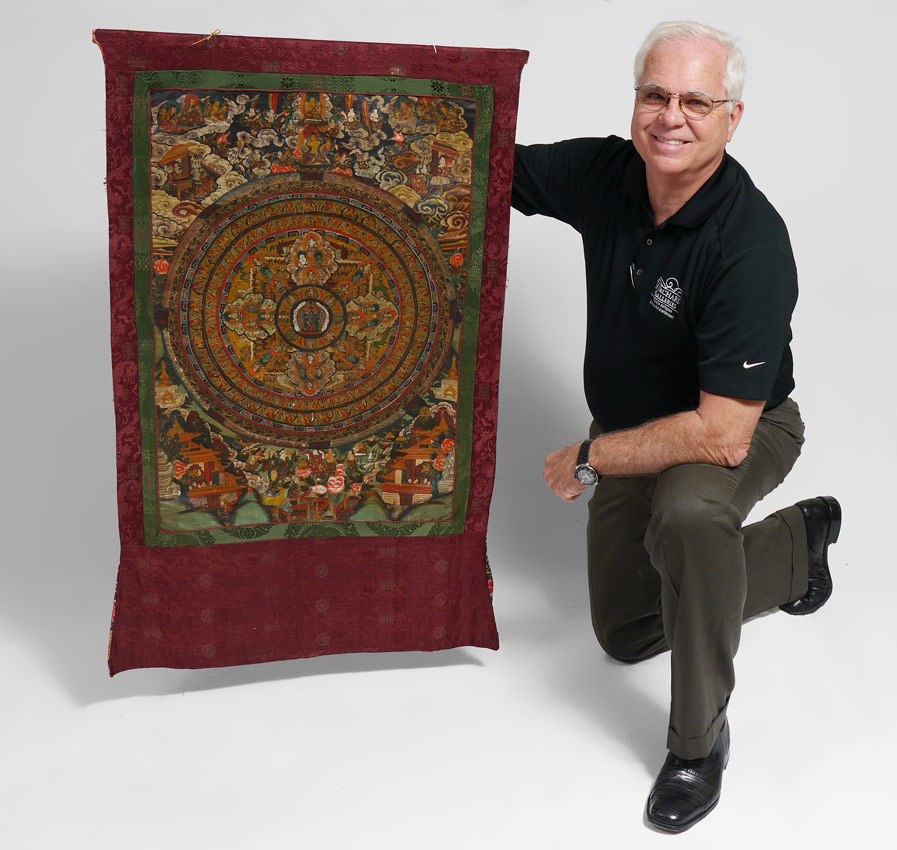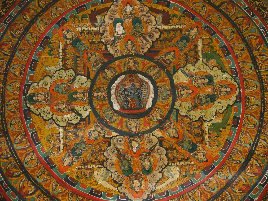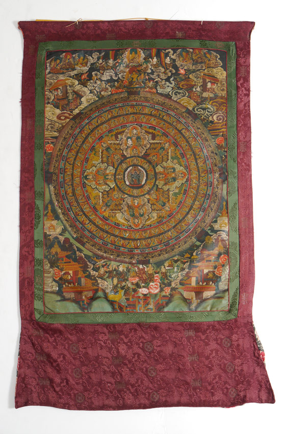 TIBETAN THANGKA: Central medallion with concentric circles featuring various deities, other decoration featuring buildings and figures. Overall measures 46'' x 29''. Actual age unknown.