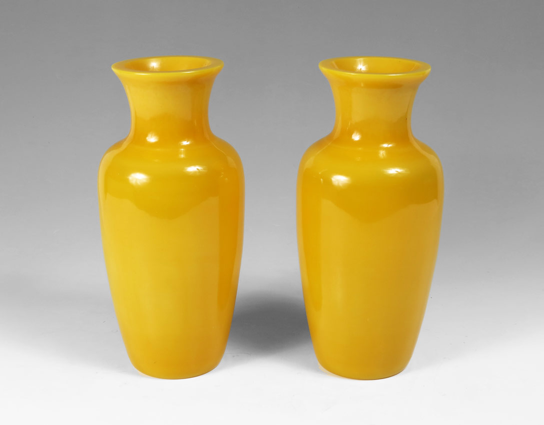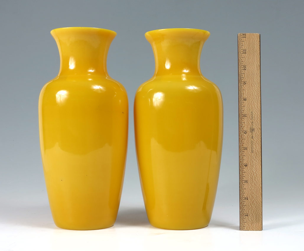 PAIR CHINESE IMPERIAL YELLOW PEKING GLASS VASES: Each in a baluster form, unsigned. 12 1/4'' h. x 5 1/2''.