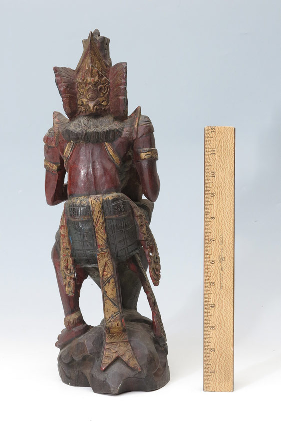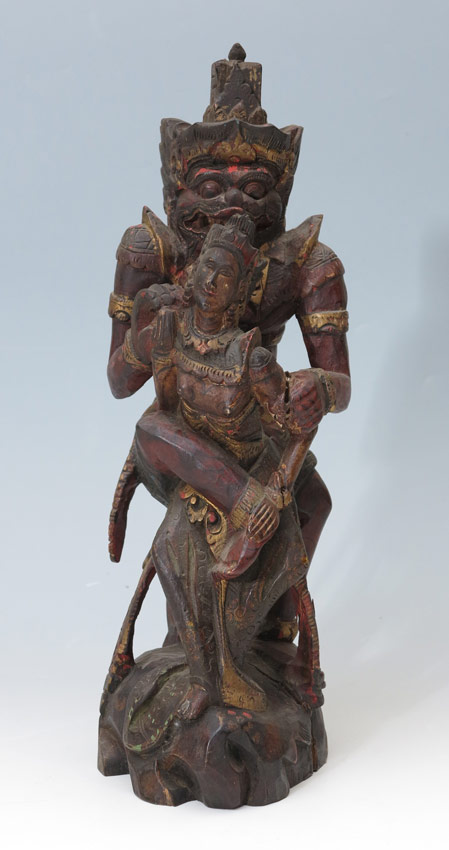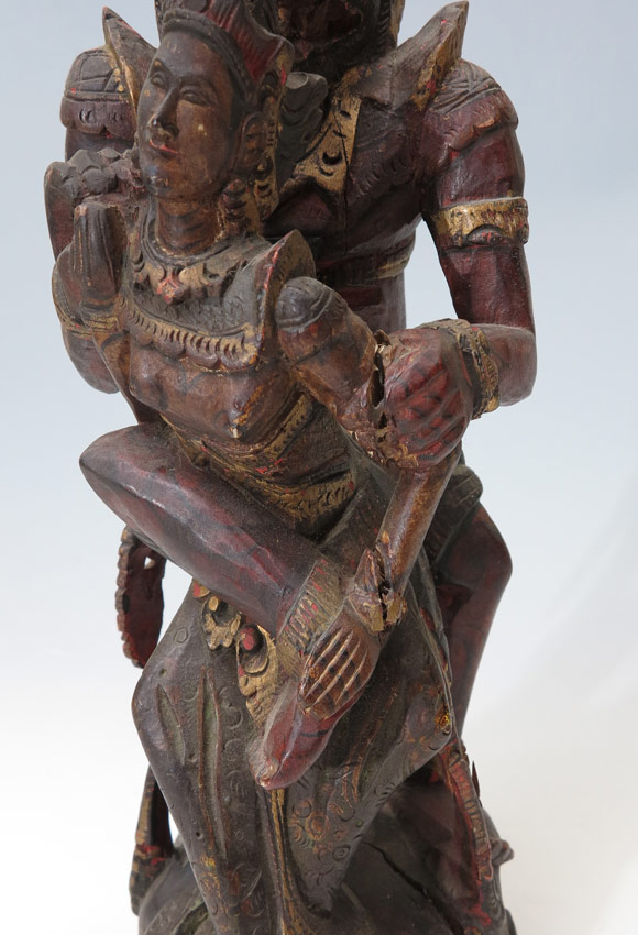 PAINT DECORATED TIBETAN CARVED DEITY: Polychrome paint decorated figure of a Tibetan deity and woman. Measures 16 1/2'' h. x 6 1/4''. Actual age unknown.