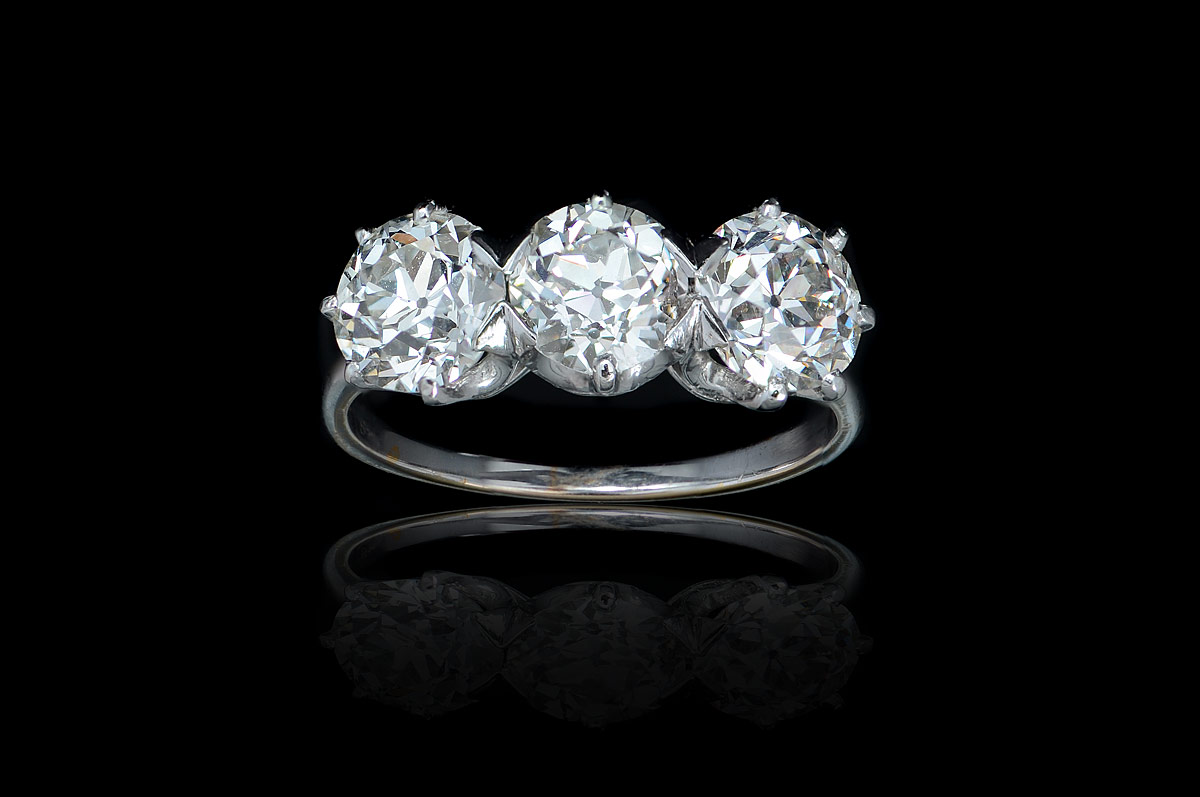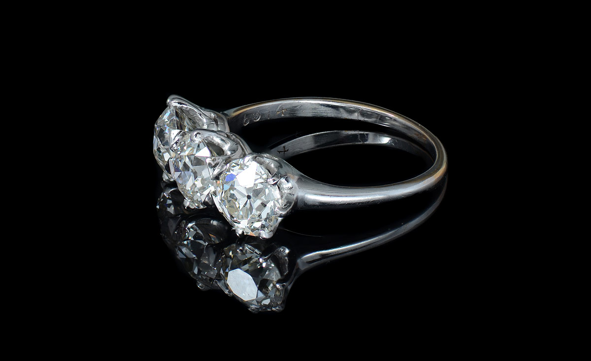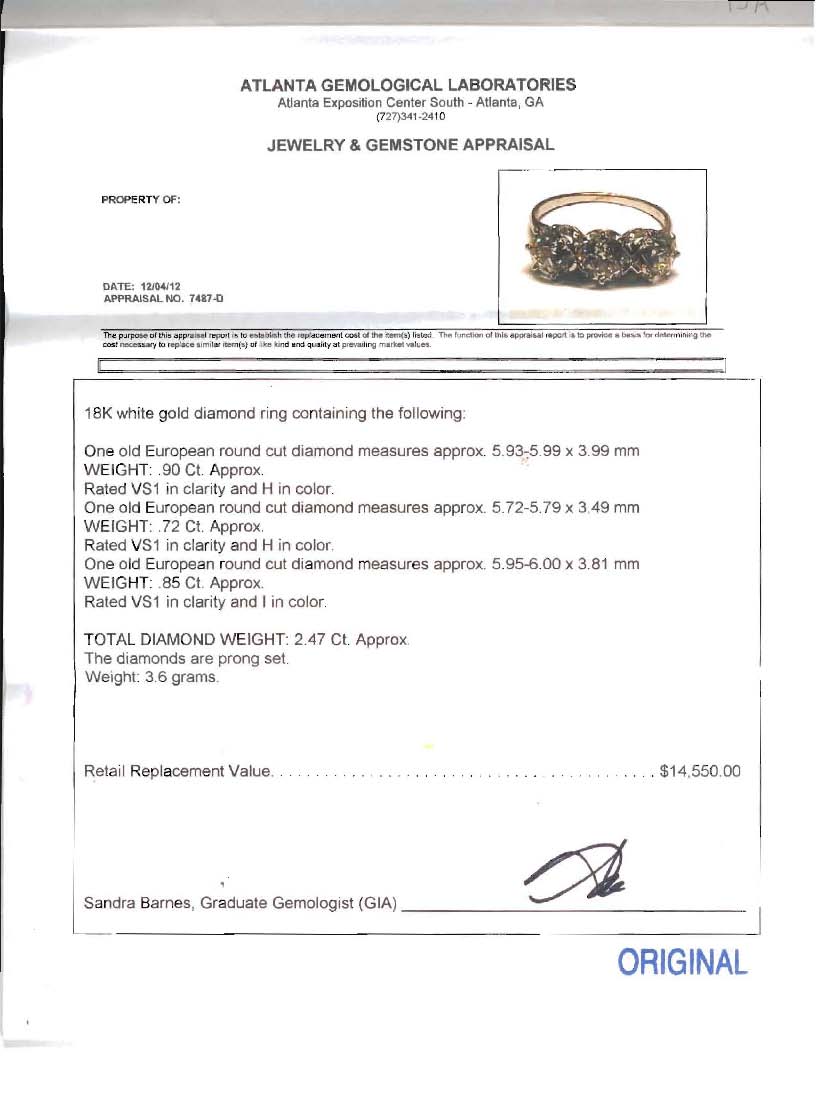 18K ART DECO 3 STONE DIAMOND RING: 18K white gold ring with three old European cut diamonds. One is .90 Ct, one .85 Ct, and one .72 Ct. All are rated VS1 in clarity, colors H-I. Prong set. Size 5.75. Weight: 3.6 grams. Sold with current Atlanta Gemological GIA graduates appraisal for $14,500.