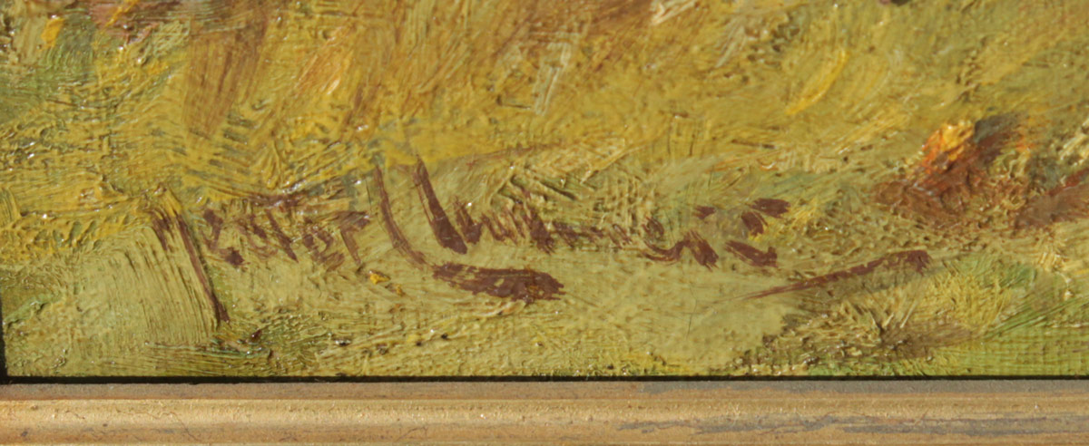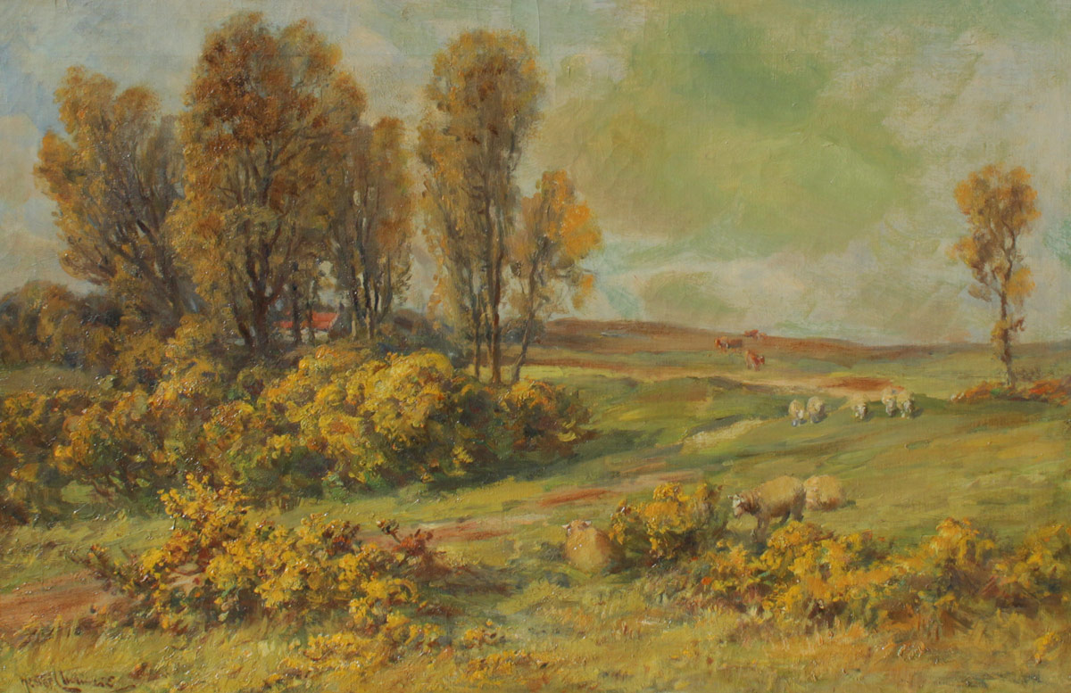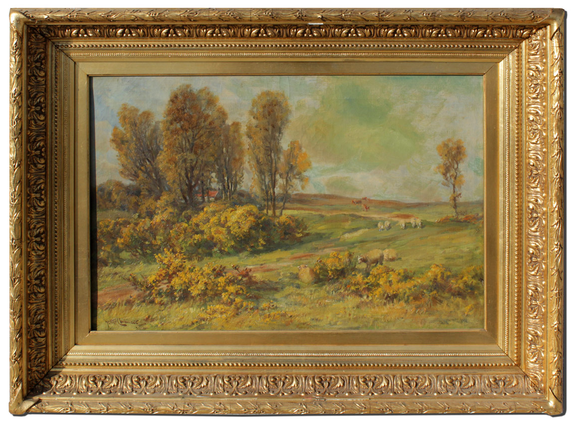 CHALMERS, Hector, (British, 1849-1943): Landscape with Sheep, Oil/Canvas, 20 1/4'' x 30 1/4'', signed lower left, encased in deep dish gilded acanthus leaf motif frame with some repair and overpaint and several areas of missing gilt, 31'' x 41'' x 4 1/4'', signed lower left.