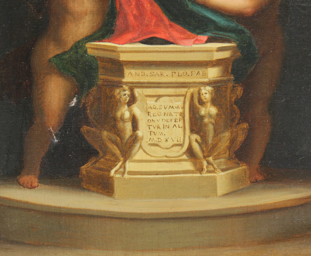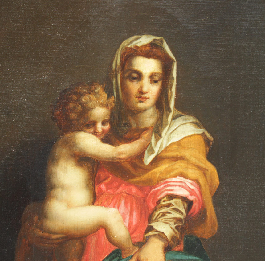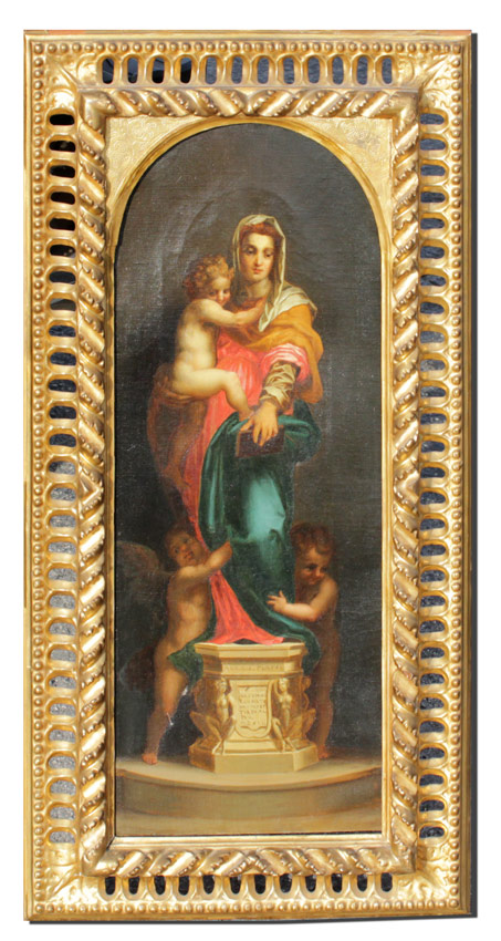 MADONNA WITH PUTTI PAINTING AFTER DEL SARTO: Oil/Canvas, 25 1/2'' x 10 1/4'', pierced carved and gilded Italian frame, 32 1/2'' x 16 3/4''.