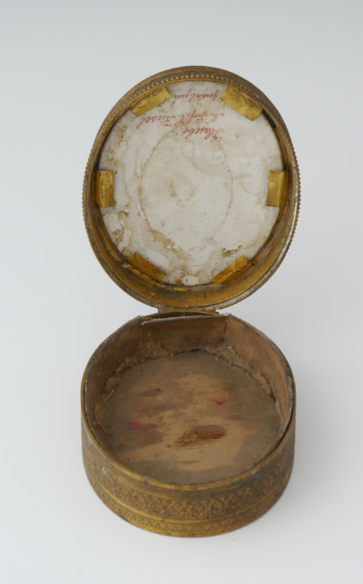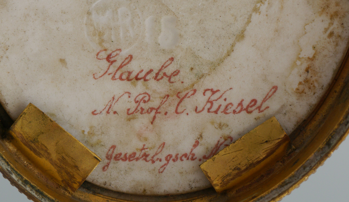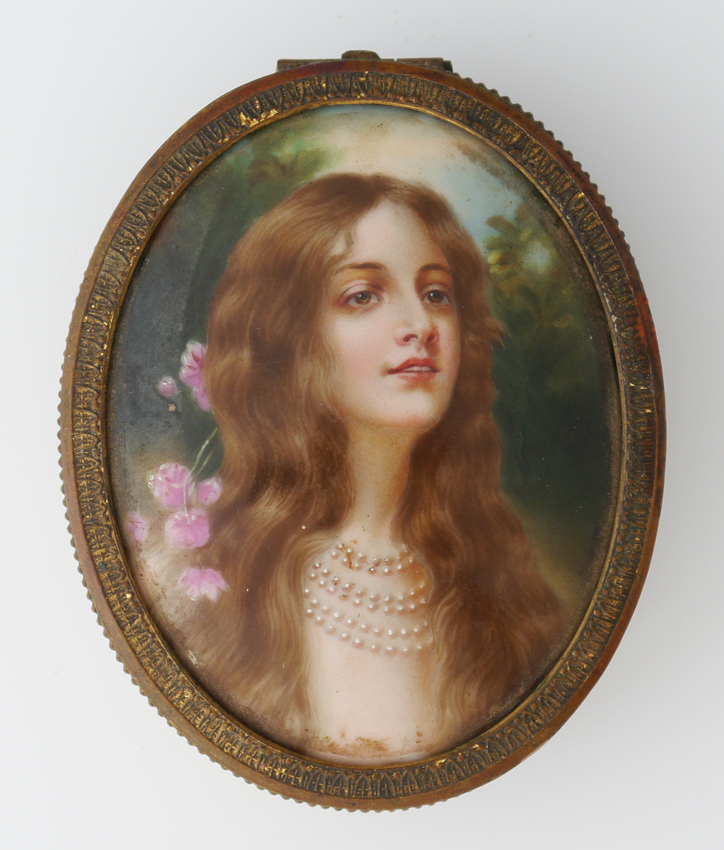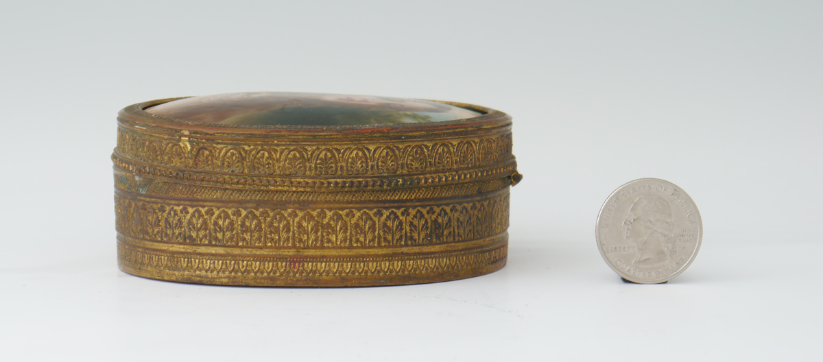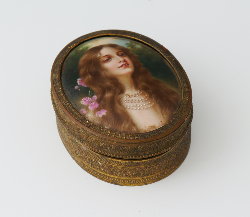 HUTSCHENREUTHER PAINTED PORCELAIN & GILT METAL DRESSER BOX: Inset oval porcelain, ''Glaube'', Painting on Porcelain after Kiesel, oval dimension 3 1/4'' x 2 5/8'', inset in an embossed gilt metal box with wear to the edges. CONDITION: Needs cleaning.