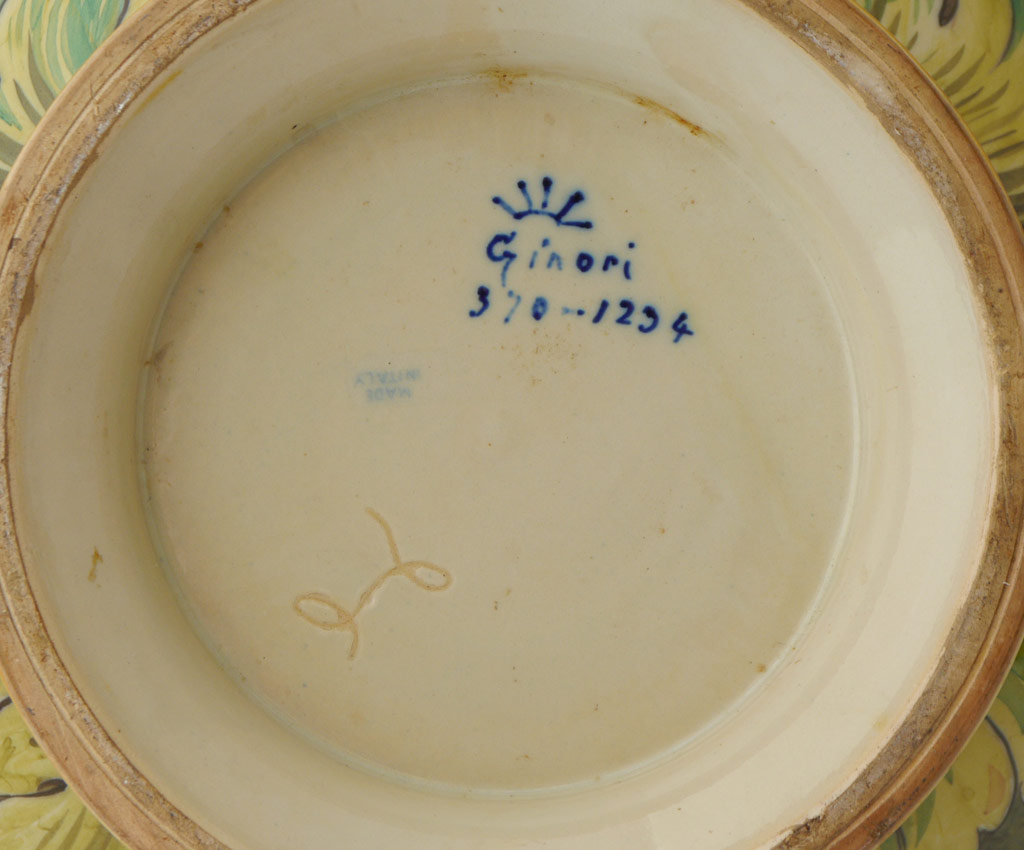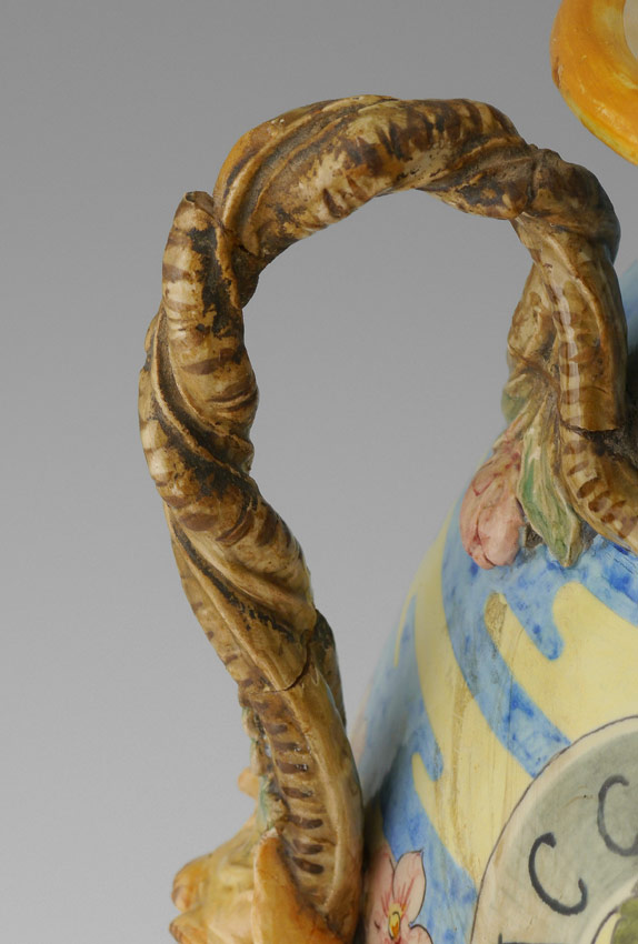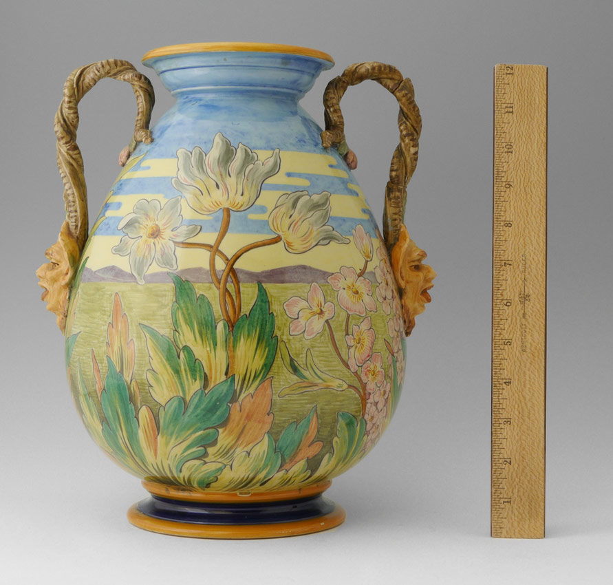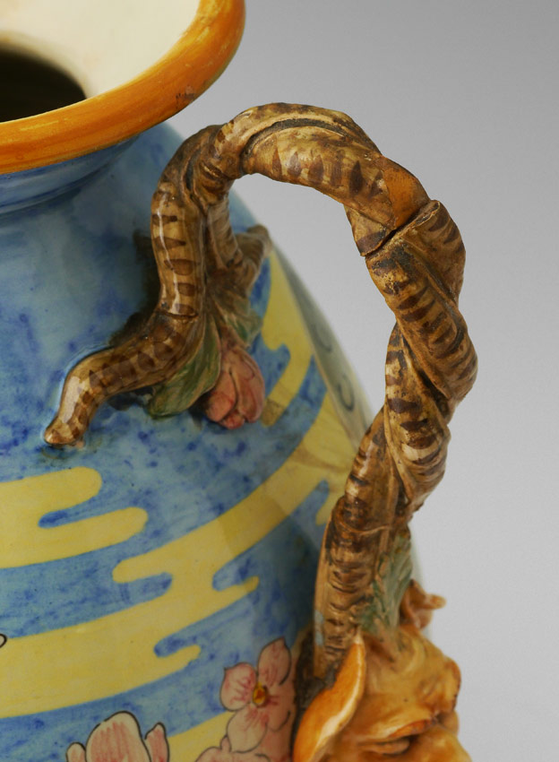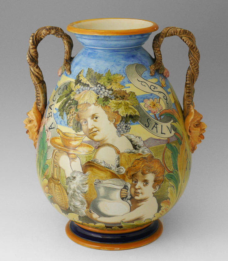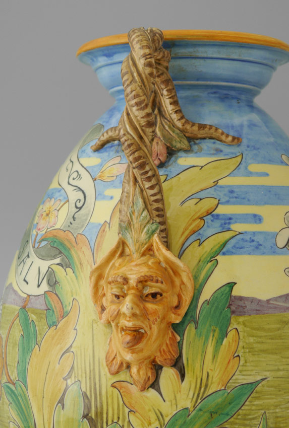 GINORI DOUBLE HANDLE MAJOLICA VASE: Neo-classical and floral motifs, double twist handles ending in masquerons. Marked Ginori, 370-1234, Made in Italy and incised cursive L. Measures 12 1/2'' x 10 1/2''.