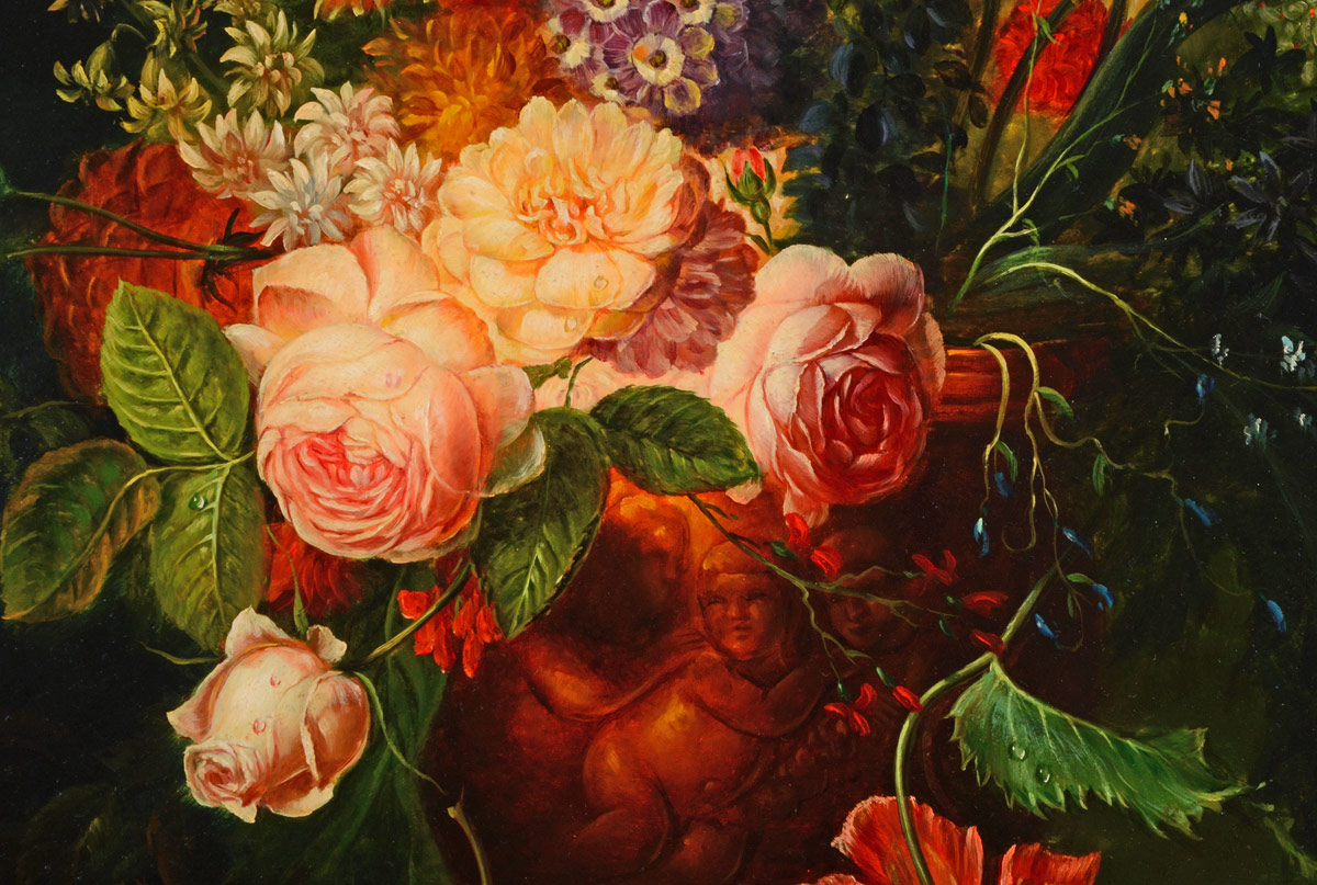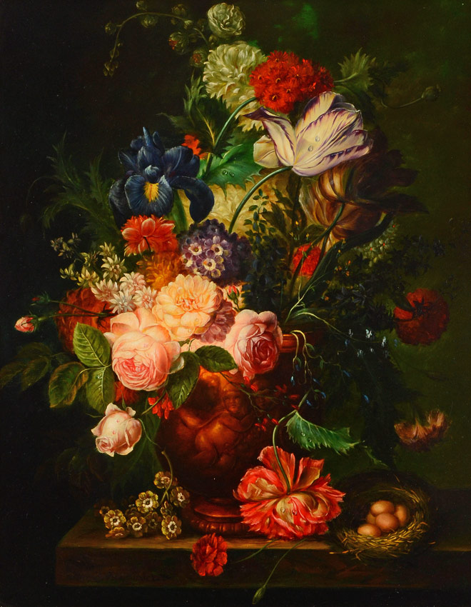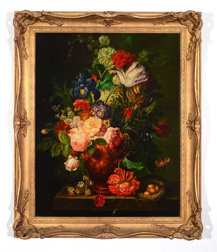 FRIEDLANDER, Hedwig, (Austrian, 1863-1916): Neoclassical Floral Bouquet, Oil/Board, 19 1/2'' x 15 1/2'', signed lower right, bears a Sotheby's label affixed verso, encased in a pierced carved contemporary frame 23 1/2'' x 19 1/2''.