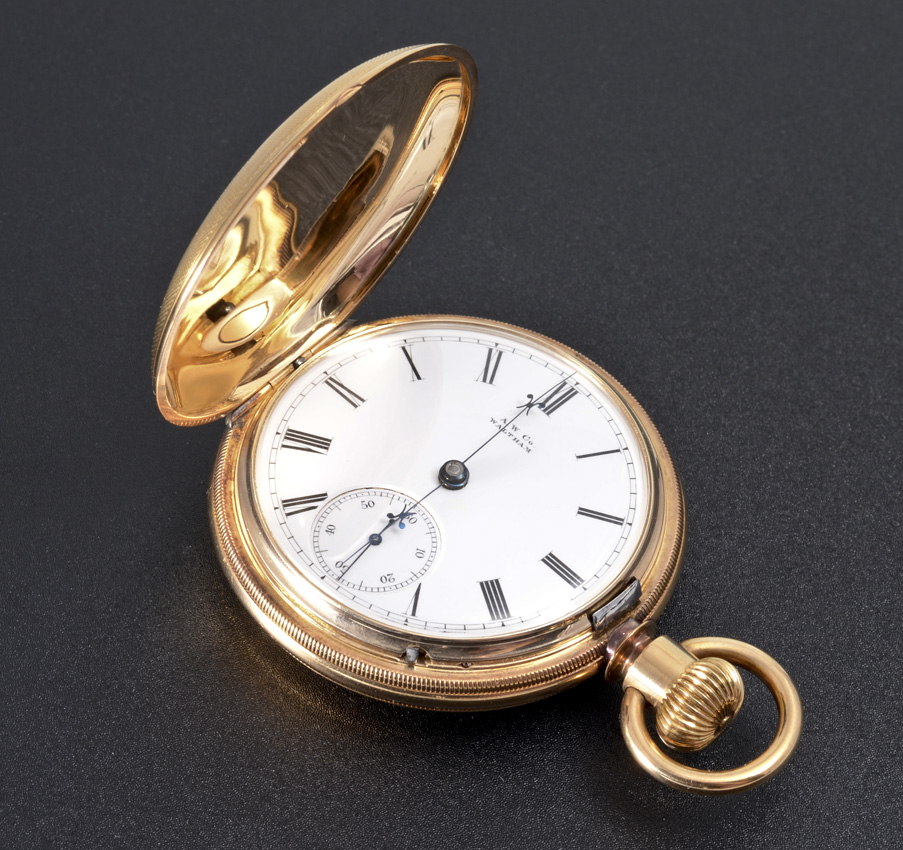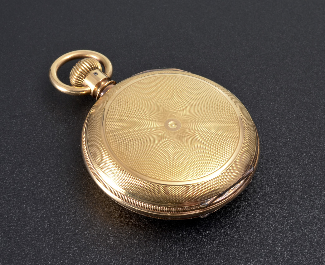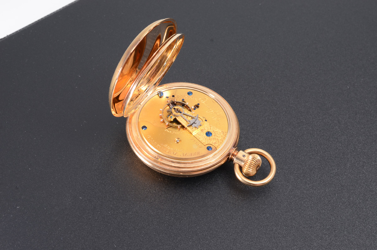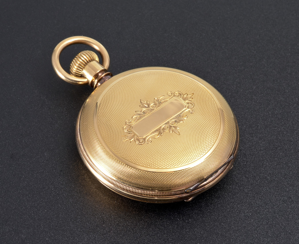 18K YELLOW GOLD WALTHAM HUNTER CASE POCKET WATCH: Circa 1905, size 18 hunter case, 17 jewel movement, pendant wind and lever set, serial #1436650.