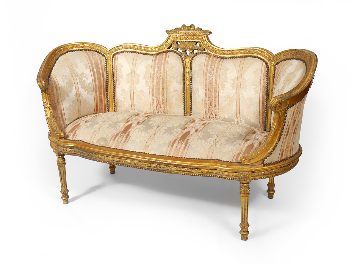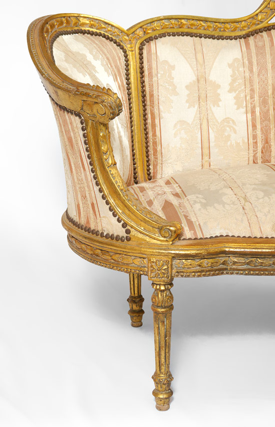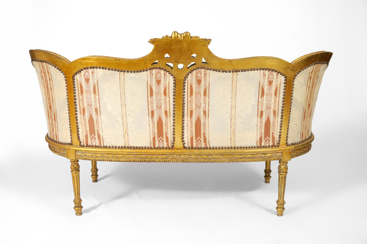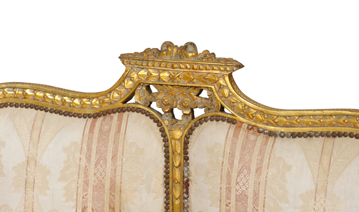 19th C LOUIS XVI STYLE GILTWOOD SETTEE: Partitioned serpentine back continues into the curved arms, carved center crest and frame. Measures approx. 36'' tall x 58'' x 23''.