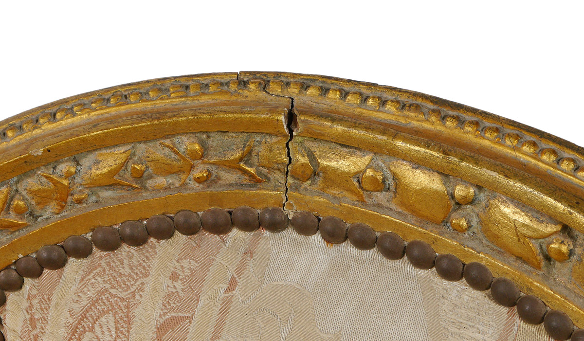 CONDITION: Crack to top rail, general wear, spots to fabric.