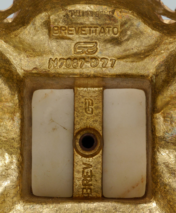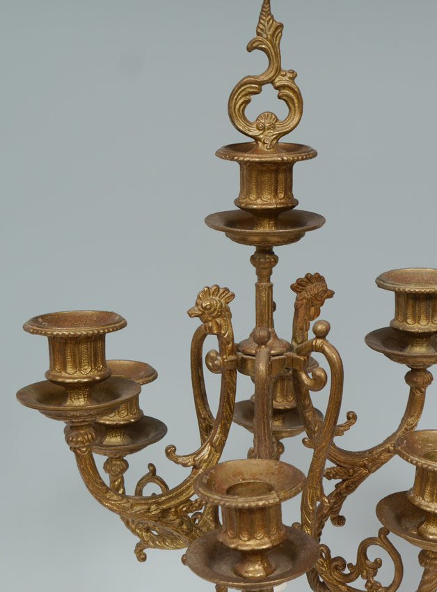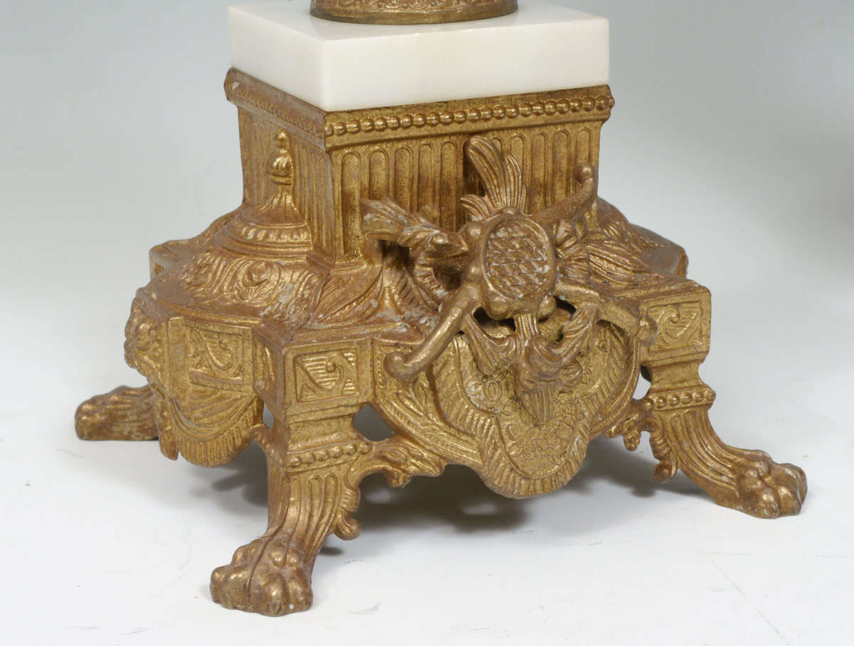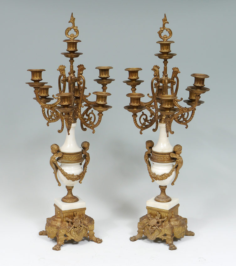 PAIR ITALIAN BREVETTATO GILT METAL CANDELABRA: 7 light candelabra with gilt metal and white marble. Cast figural cherub and garland decoration on body, cast base with paw feet. Marked inside base Made in Italy, Brevettato, N7987-877. 23 3/4'' h. x 11 1/4''.