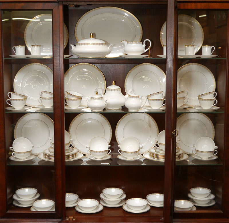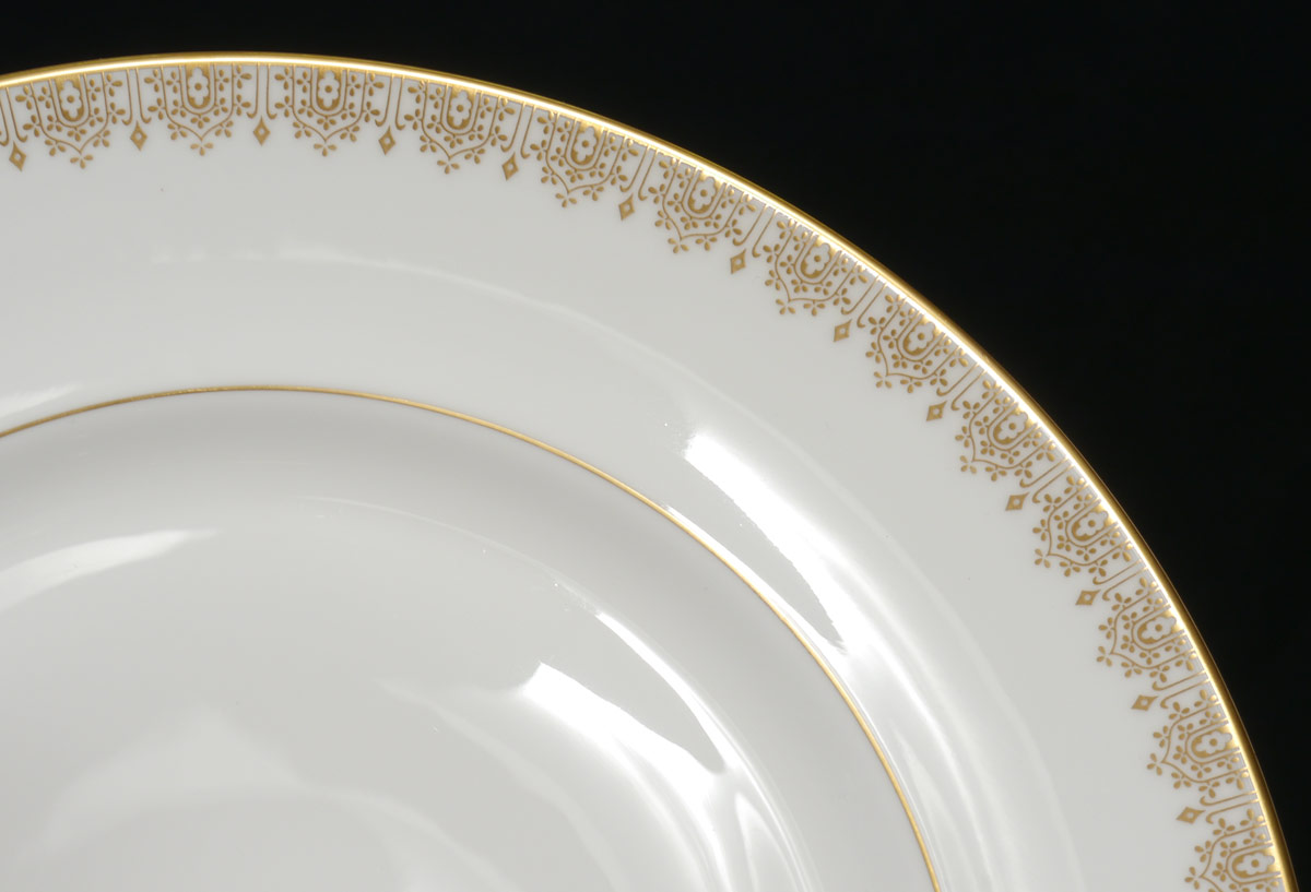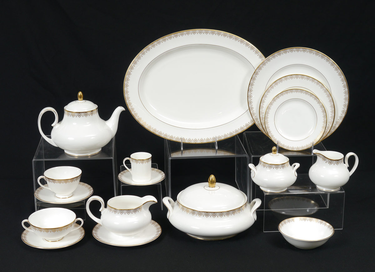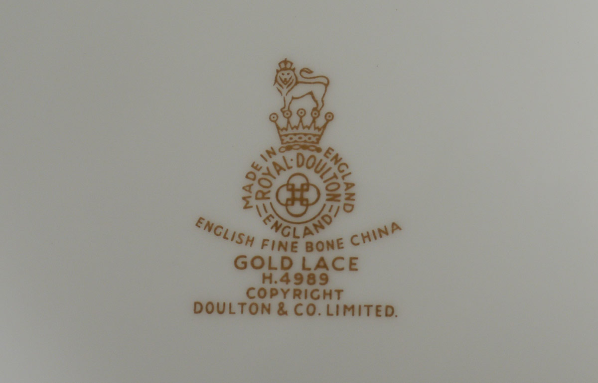ROYAL DOULTON ''GOLD LACE'' FINE CHINA SERVICE FOR 12: Approx. 102 pieces to include 12 each of dinner plates (10 1/2''), salad plates, bread plates, dessert bowls, tea cups, cream soups, and saucers. Also 6 demi-tasse cups with saucers, teapot, cream pitcher, sugar, gravy, platter (15 1/2''), and the round covered vegetable bowl.