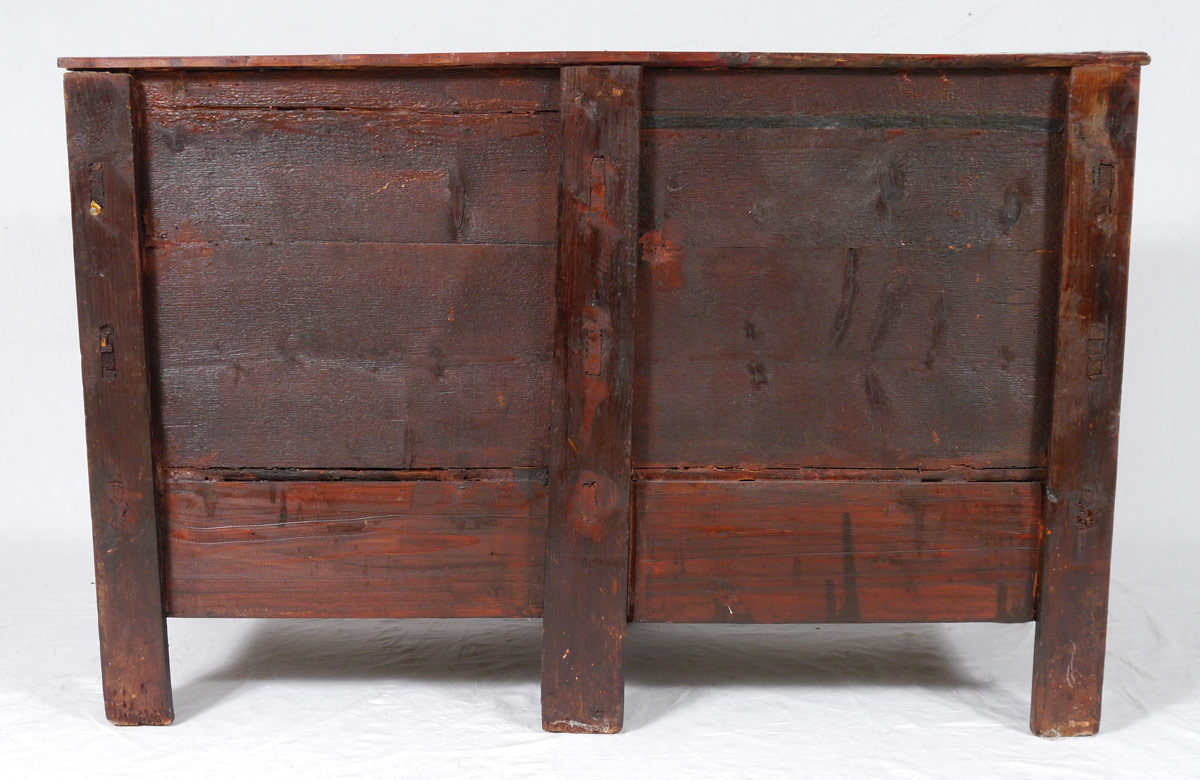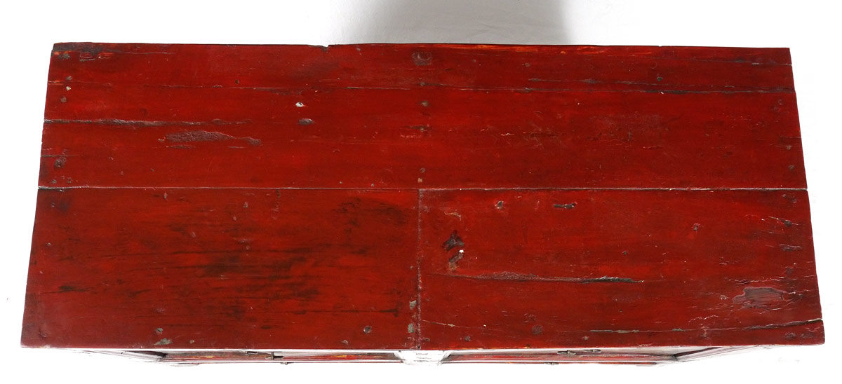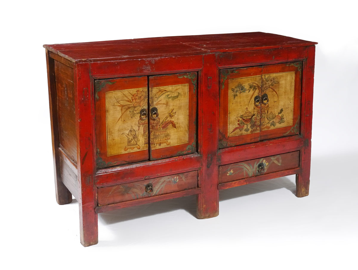 TIBETAN LACQUERED AND PAINTED CABINET: Four doors over 2 half length drawers. Rich red lacquer with paint decorated doors. Measures approx. 33'' tall x 50 1/2'' x 20 1/2''.