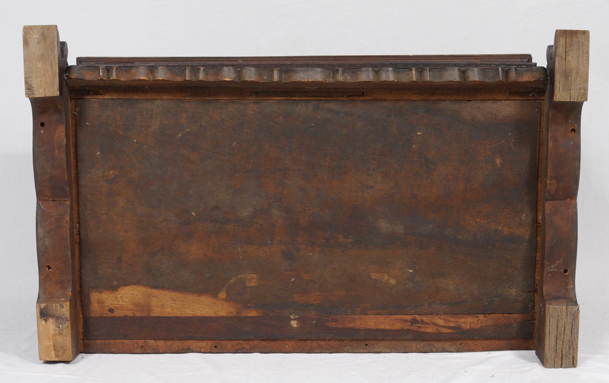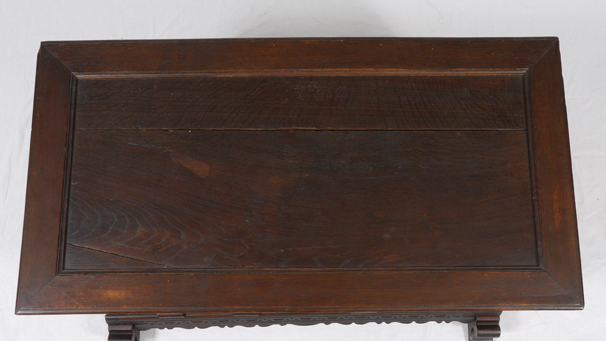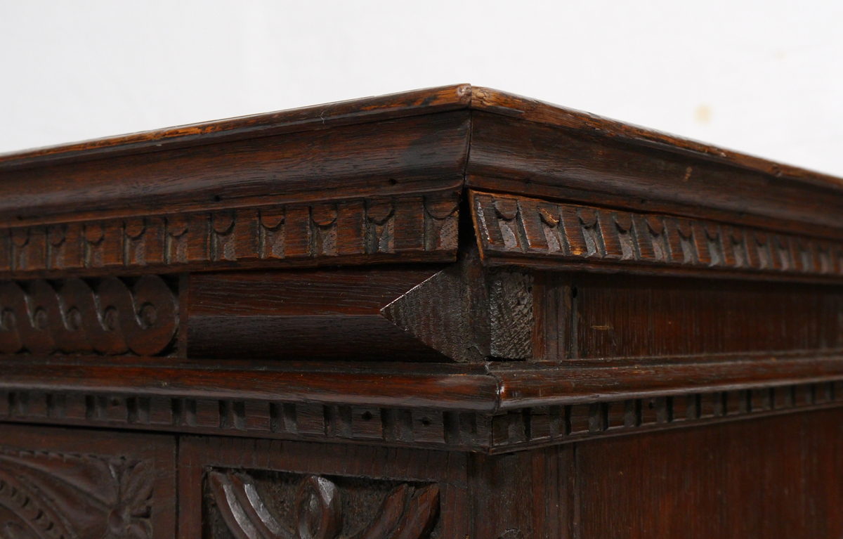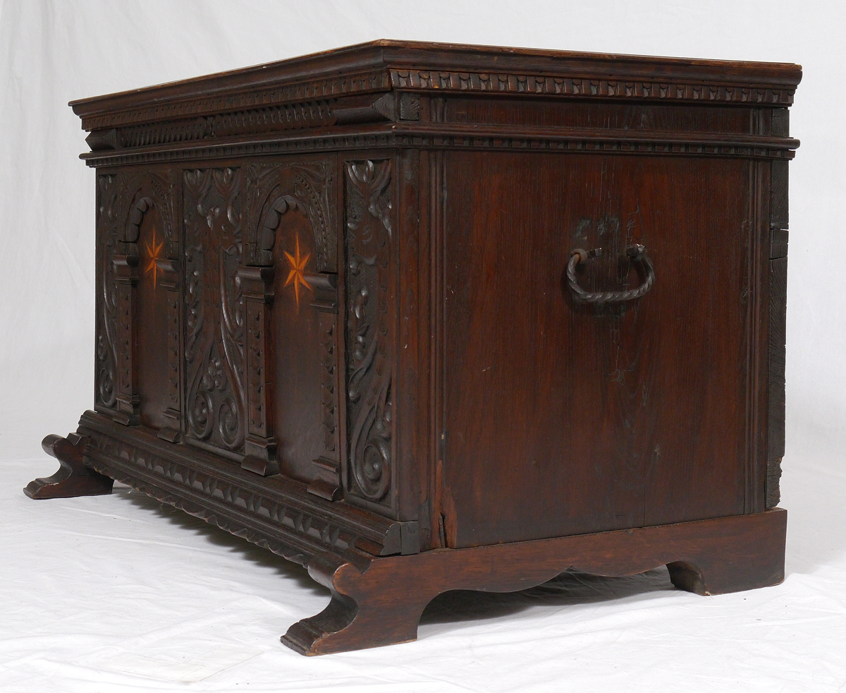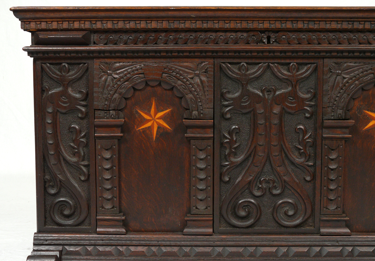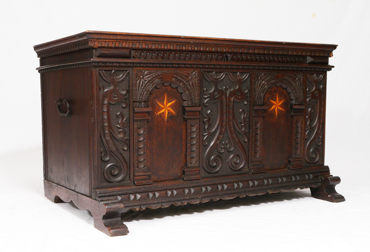CARVED & INLAID BLANKET CHEST: Carved front with figural mythological creatures, inlaid 6 sided stars, shaped skirt and feet. Iron hardware. 23'' h. x 39 3/4'' x 23 1/2''.