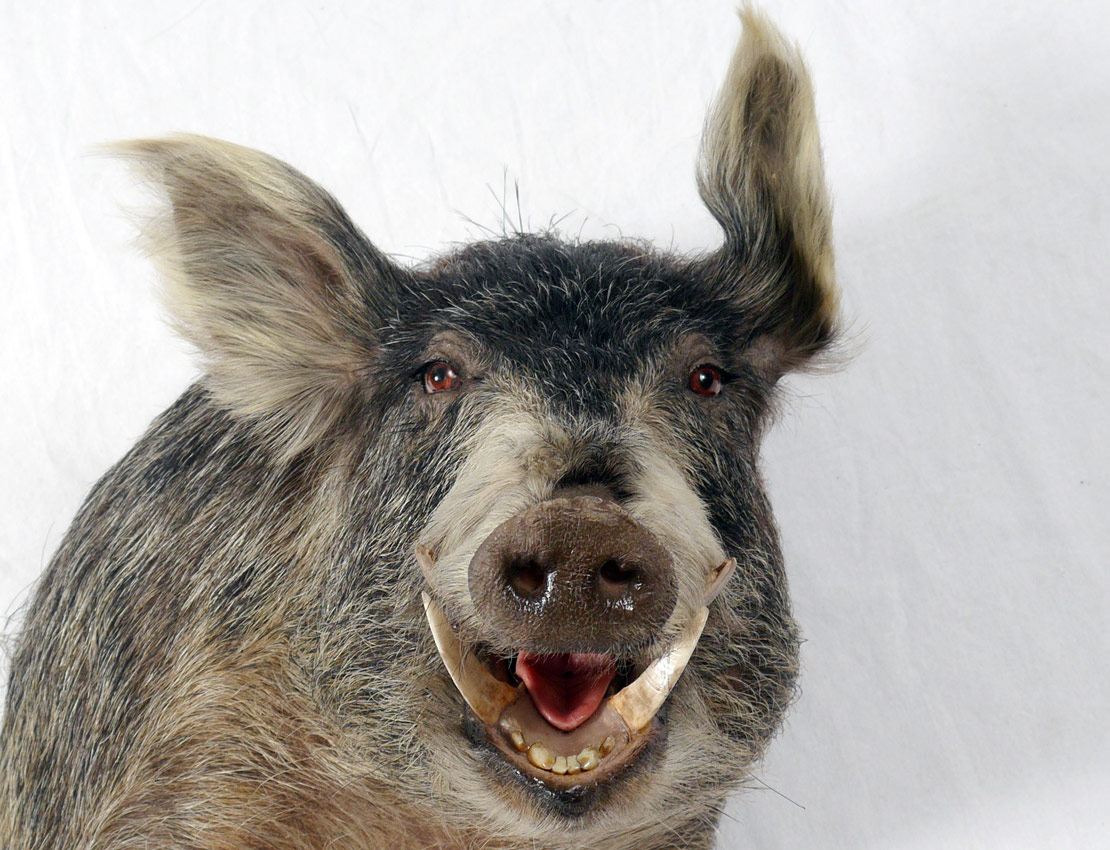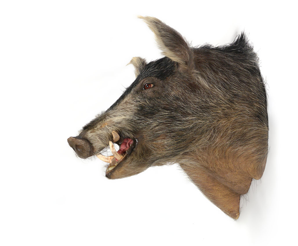 WILD BOAR HEAD TAXIDERMY WALL MOUNT: 21 1/4'' h. x 20'' x 18''.