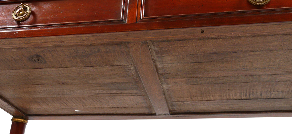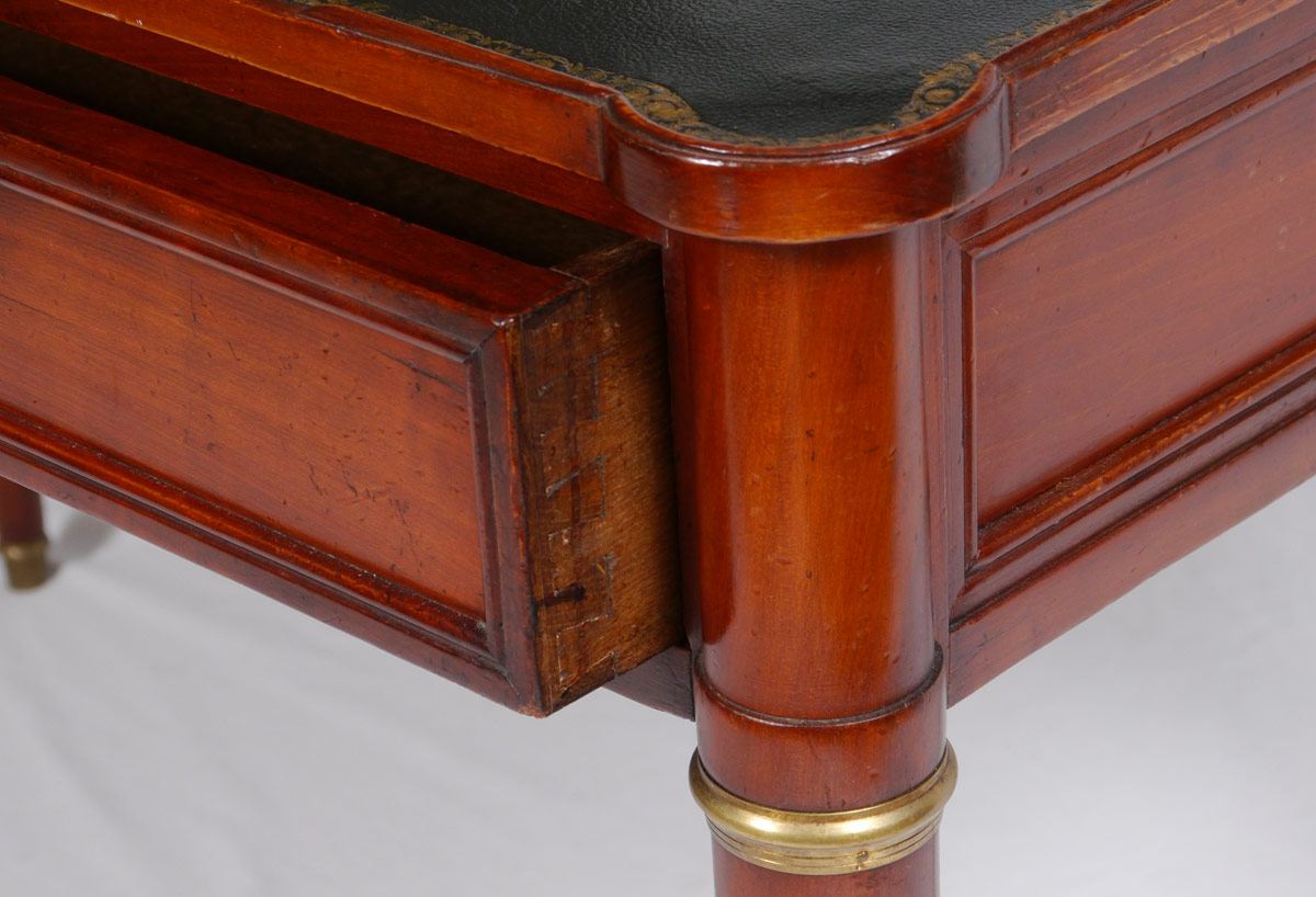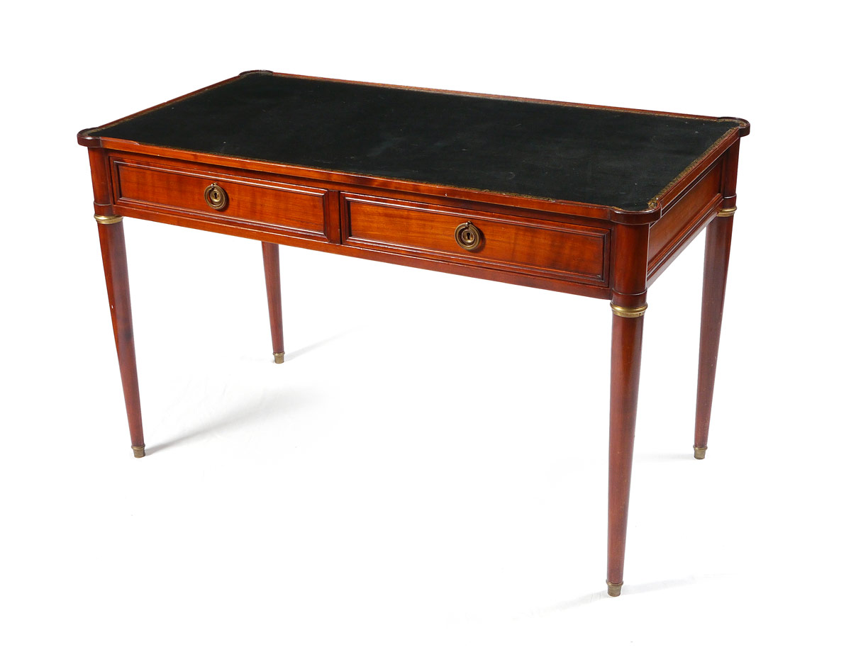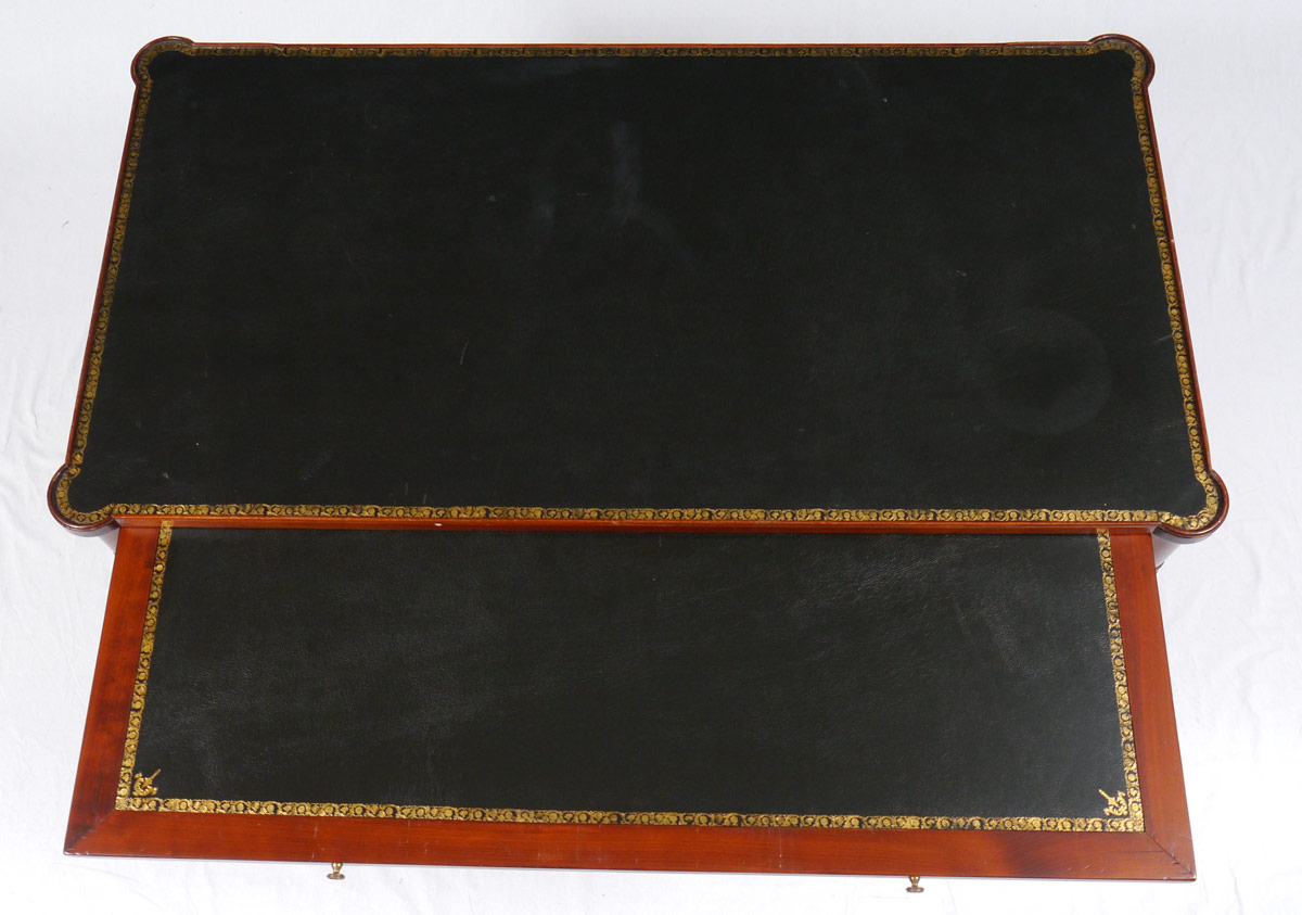 FRENCH LOUIS XVI STYLE DESK: Embossed leather top with rounded corners over 2 drawers with slide out writing surface over false drawers opposite side. Turned legs. 29 1/4'' h. x 25'' x 47''.