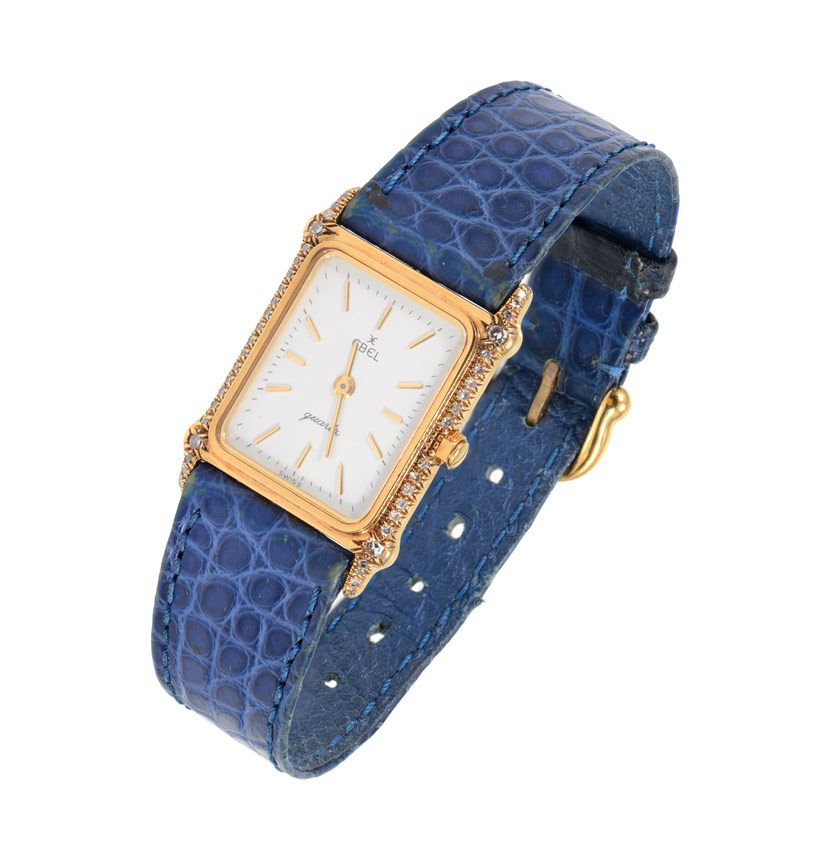 EBEL 18K GOLD AND DIAMOND LADIES DRESS WATCH: Swiss luxury watch, the case being 18K yellow gold and framed in diamonds, the dial with bar markers. Signed on the dial, case, leather strap and buckle. In good working order. Length: 7.75.