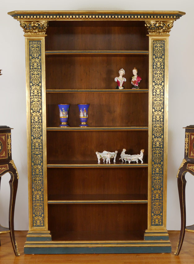 STRONG ARCHITECTURAL DETAIL BOOKCASE: From Salamanca Spain. Corinthian column front stiles under dentil molding, 5 adjustable shelves, the stenciling on the front and decoration on the sides appear to be gold leaf. 89'' h. x 63 1/4'' x 16''.