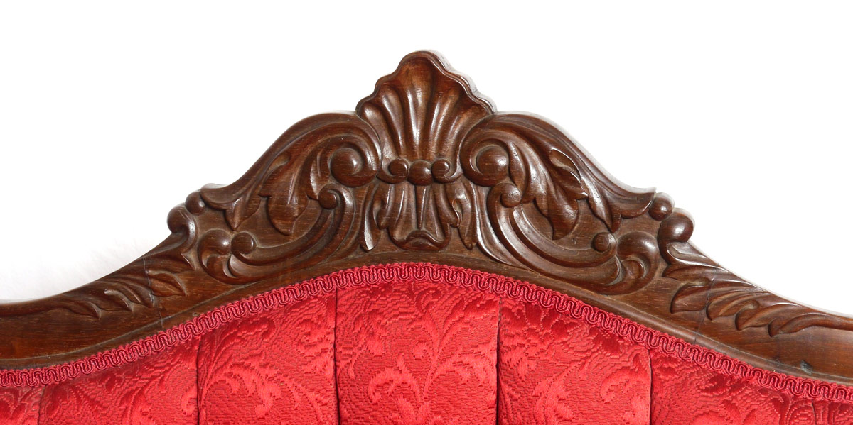 ROSEWOOD VICTORIAN SOFA: Carved and shaped back, arm rests, skirt and legs. Tufted red upholstery with floral design back. 37 1/2'' h. x 67'' x 28''.