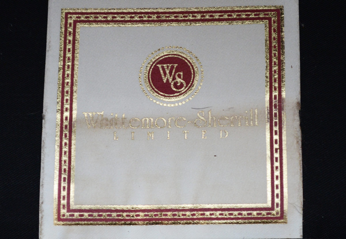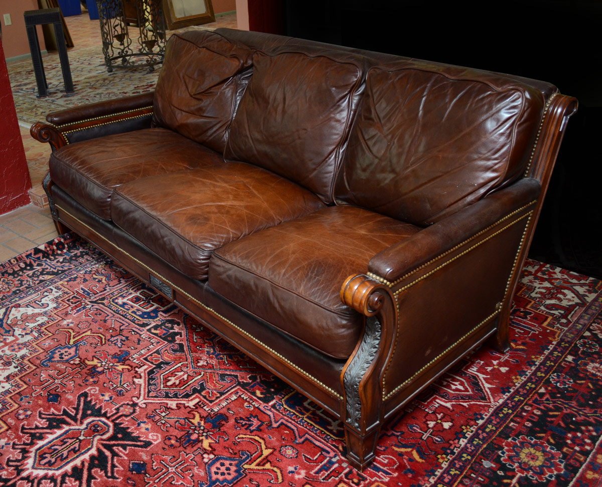 WHITTEMORE SHERRILL BROWN LEATHER SOFA: Supple brown leather tacked to carved wood frame with applied decoration. Removable seat cushions. Overall 34'' h. x 80'' x 40''.