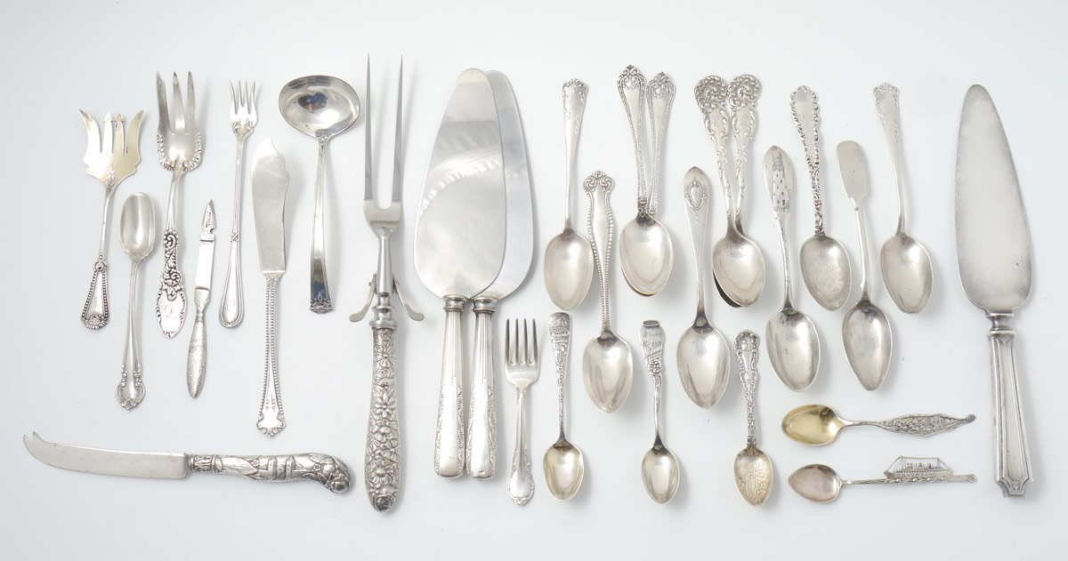 AN ASSEMBLED COLLECTION OF STERLING SILVER FLATWARE: 29 pieces by assorted makers to include Tiffany, Lunt, Alvin, Greenleaf & Cross, Whiting and more in assorted patterns. Approx. 17.4 troy oz.