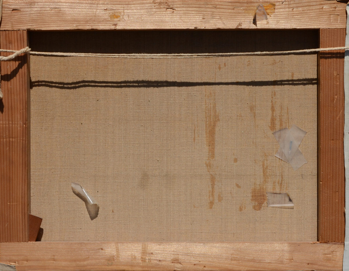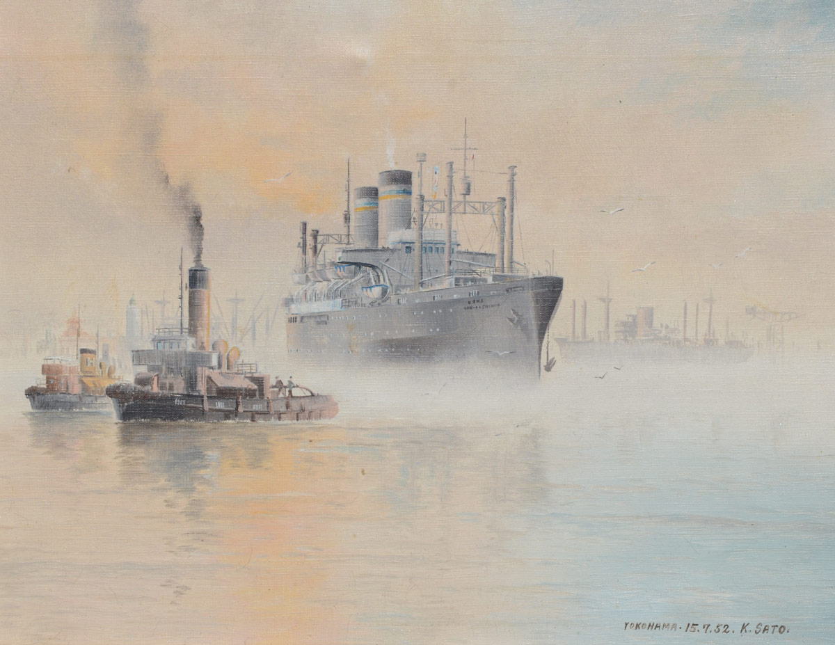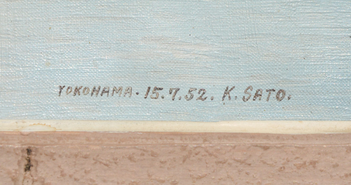 K. SATO YOKOHAMA HARBOR PAINTING 1952: Yokohama Harbor, 1952, Oil/Canvas, 12 1/2'' x 16'', signed lower right, titled and dated, painted gesso frame with wear 17'' x 20 1/2''.