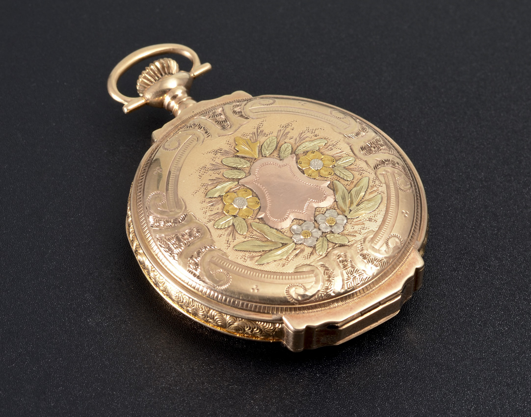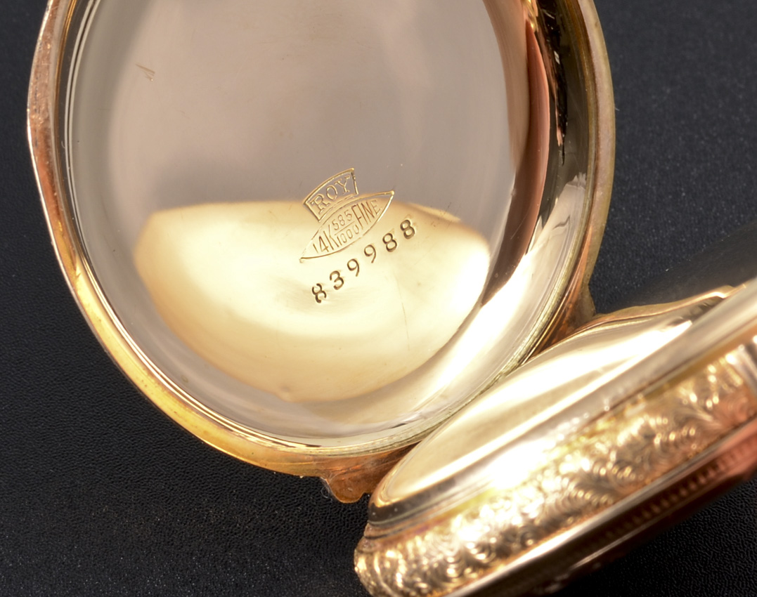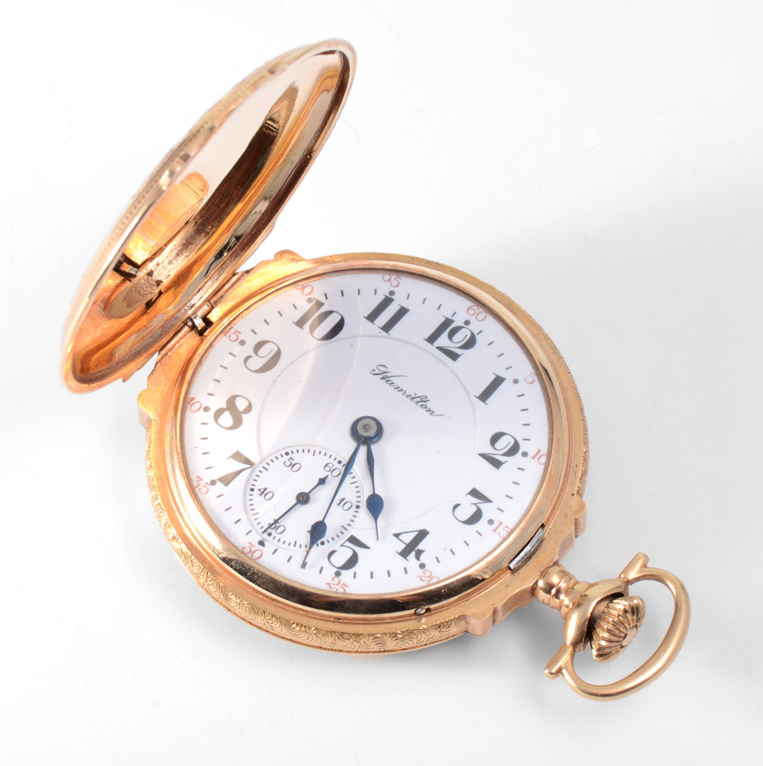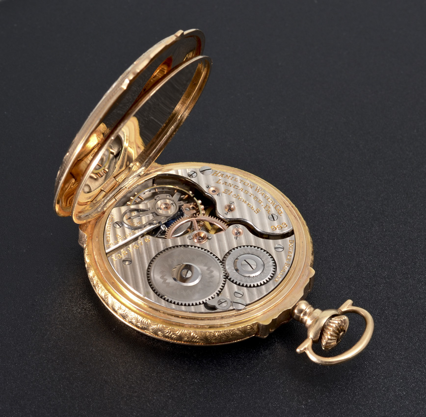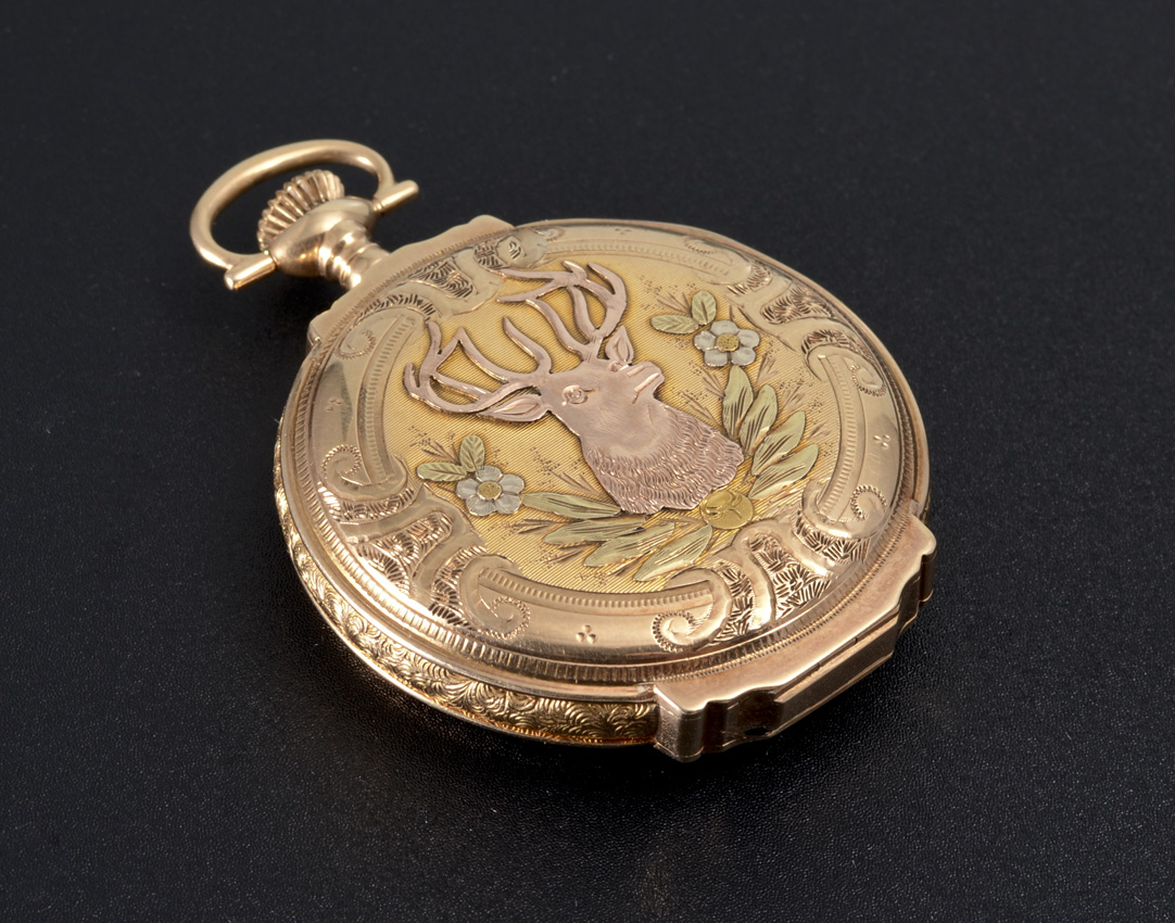 14K MULTI COLOR GOLD HAMILTON HUNTER CASE POCKET WATCH: Circa 1916, size16 hunter case with box hinge and stag motif, 21 jewel movement, pendant wind and set, serial #1351676.