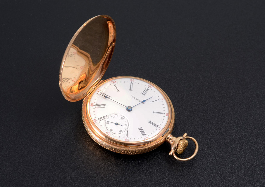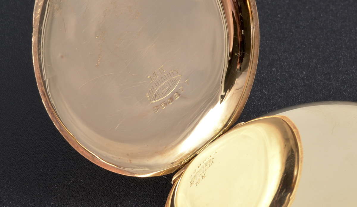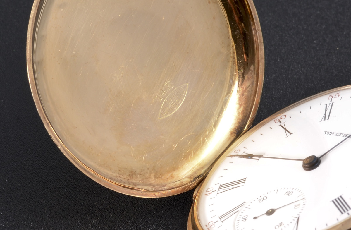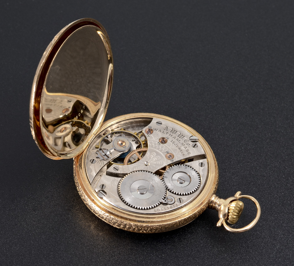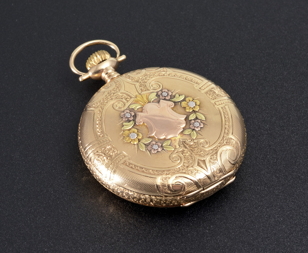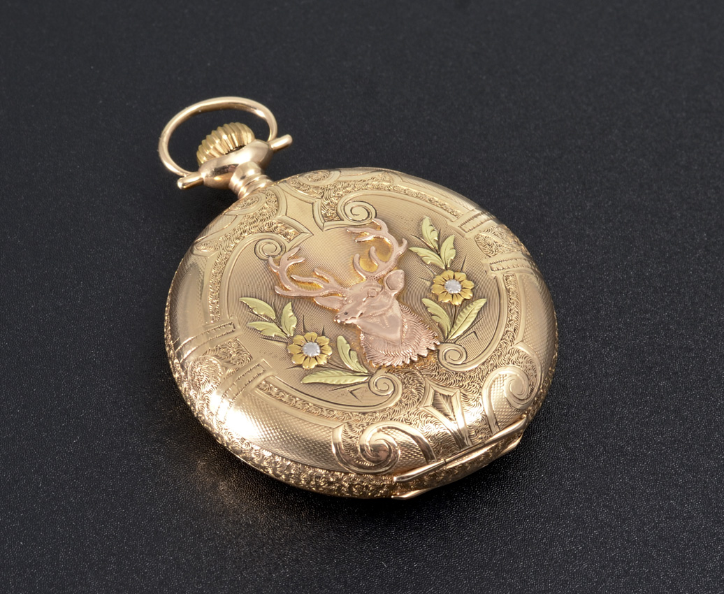 14K MULTI COLOR GOLD WATHAM HUNTER CASE POCKET WATCH: Circa 1902, size 18 hunter case with stag motif, 15 jewel movement, pendant wind and set, serial #11911107.