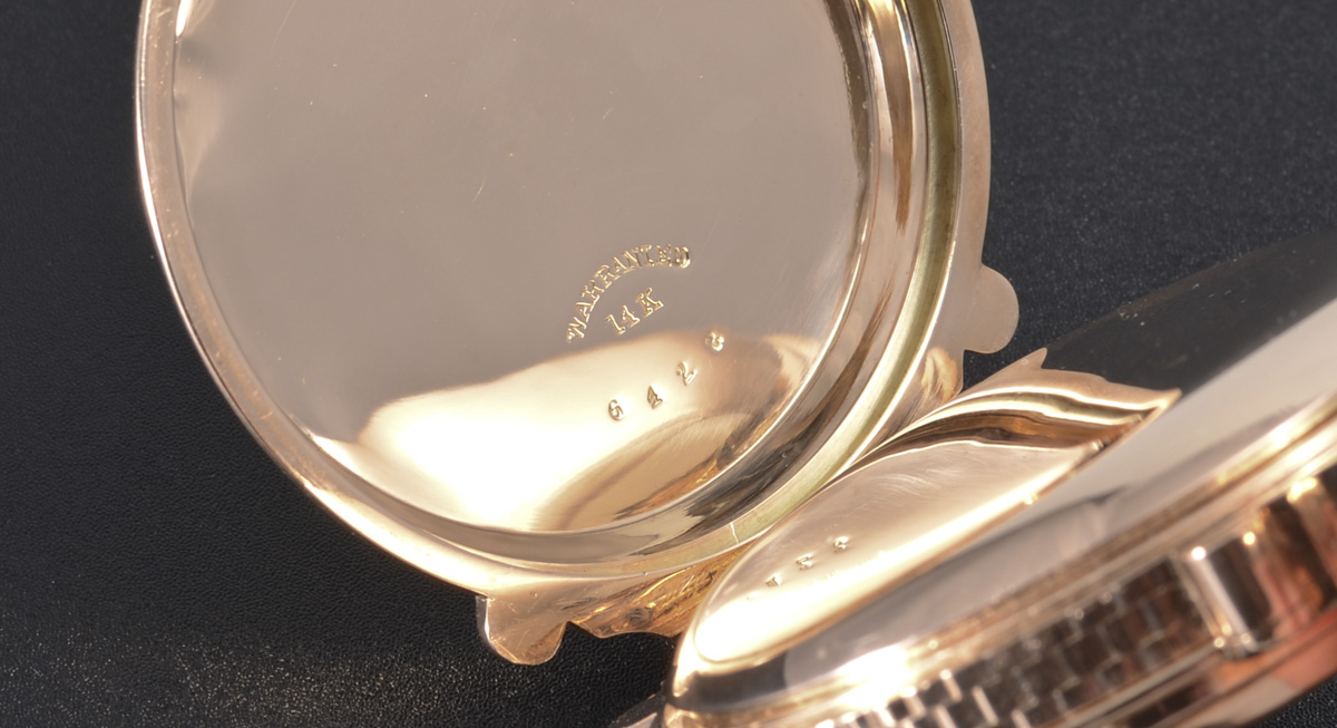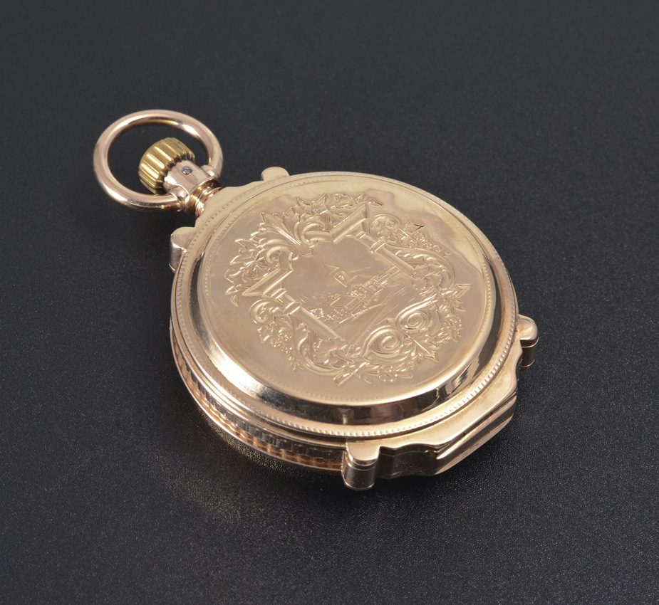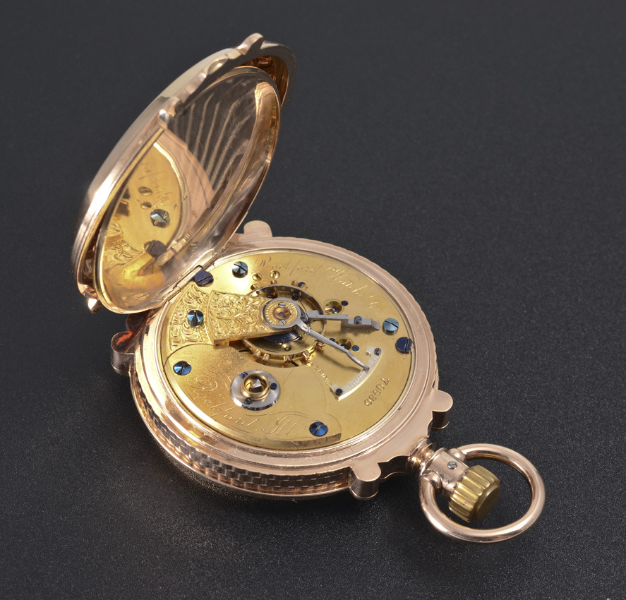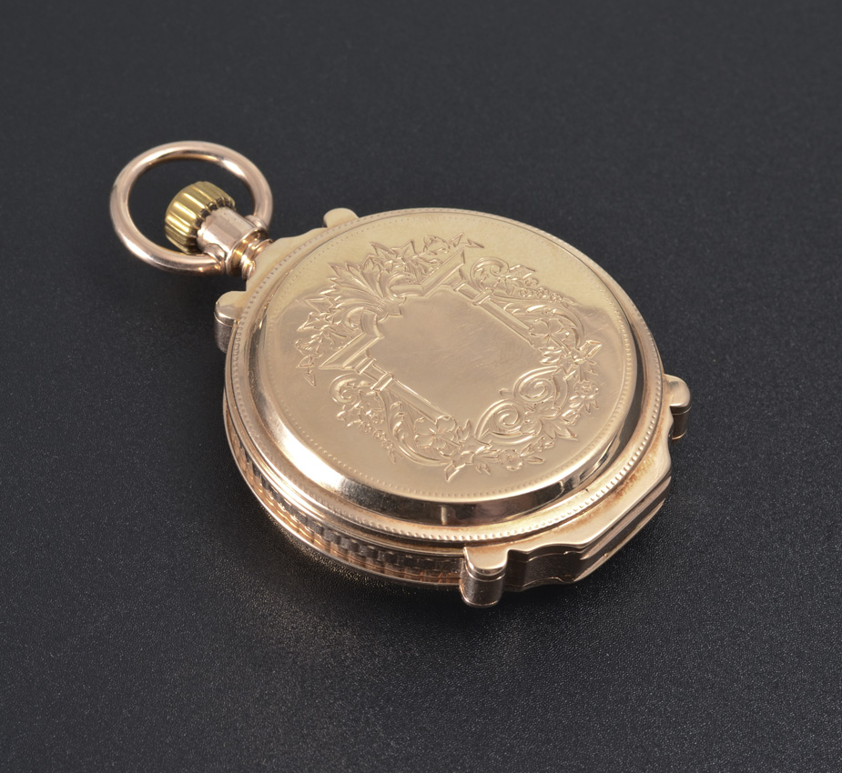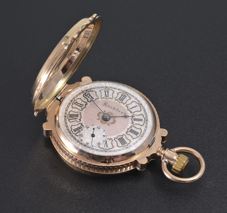 14K YELLOW GOLD ROCKFORD HUNTER CASE POCKET WATCH: Circa 1880, size 18 hunter case with box hinge and silver black peach and gold replacement dial, 17 jewel movement, pendant wind and lever set, serial #76930.