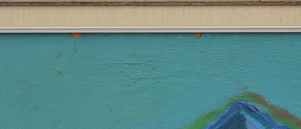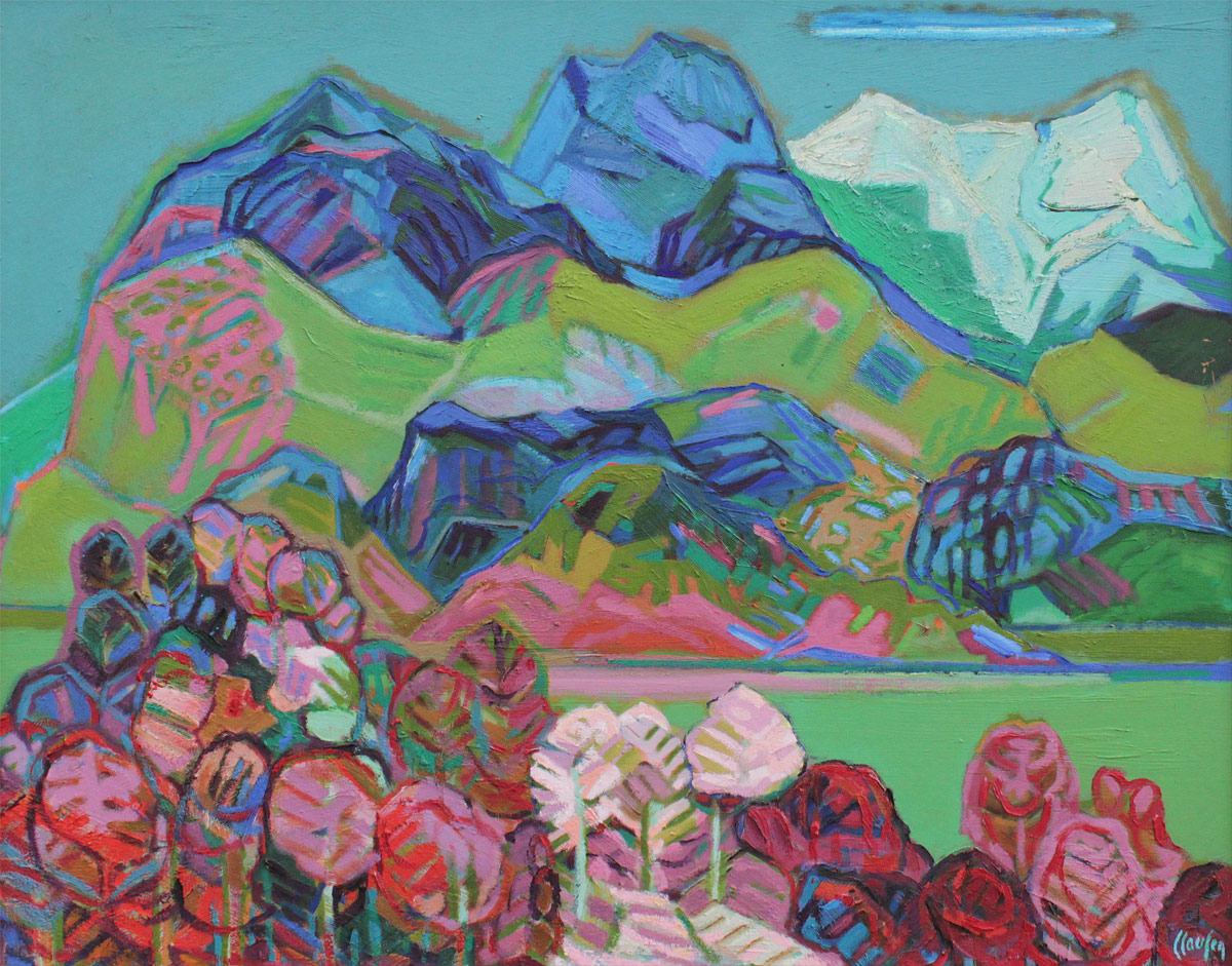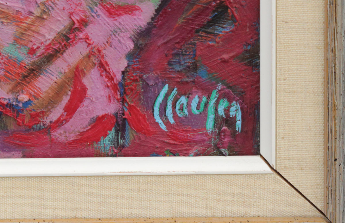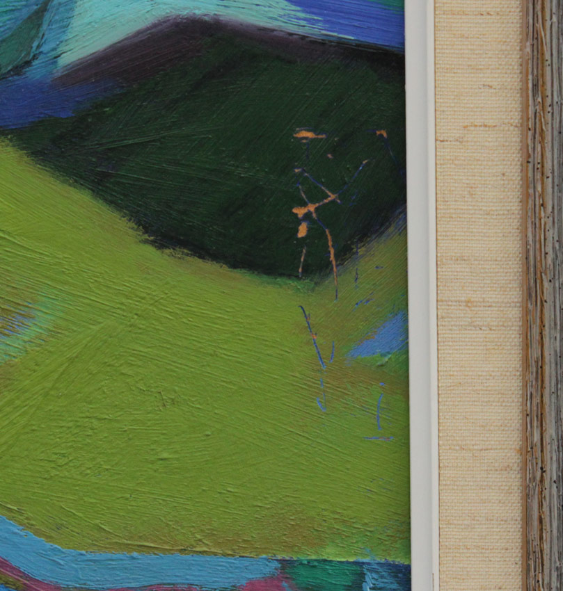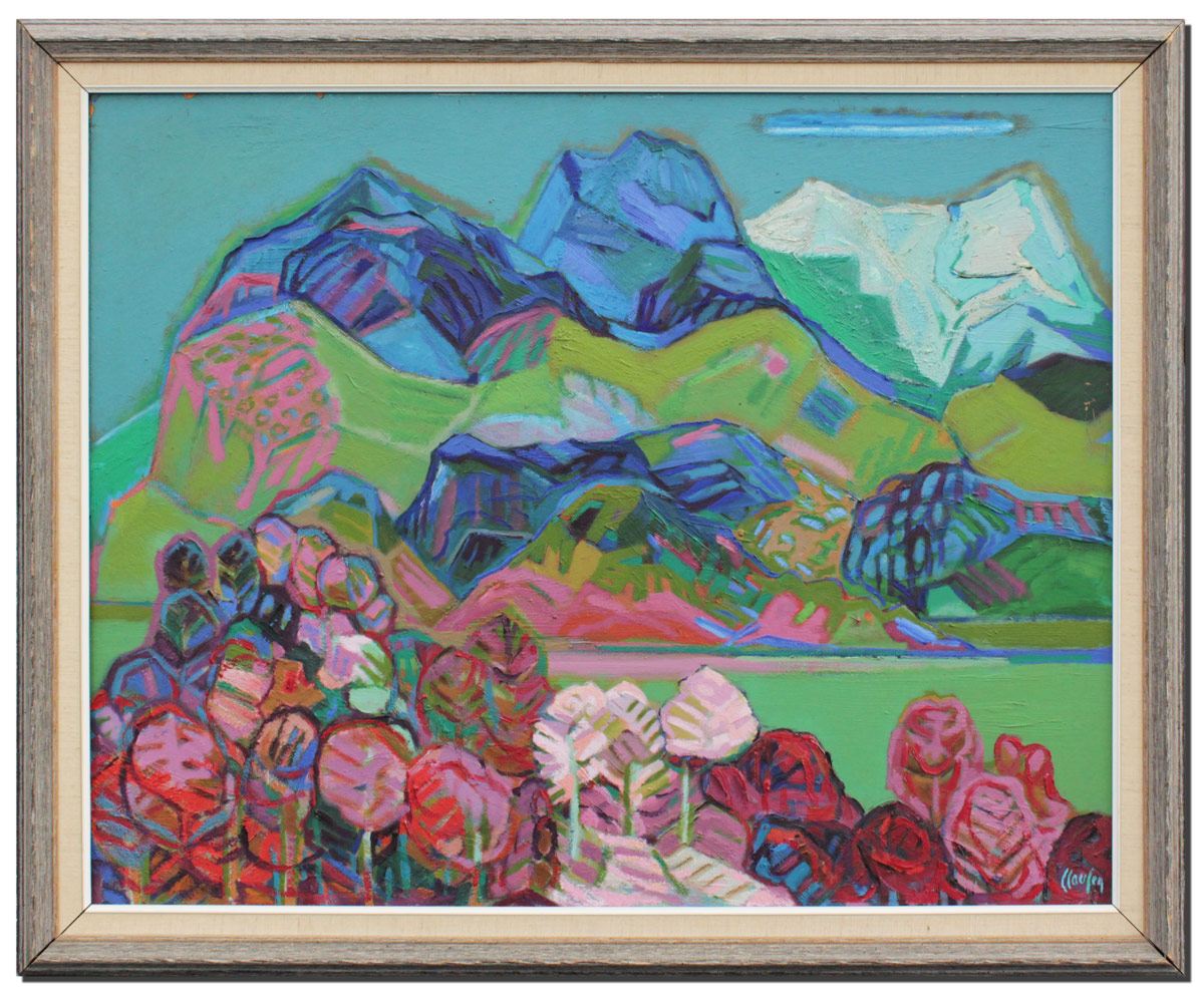 CLAUSEN, Henri, (Danish, 1909- ): Modernist Spring Mountain Valley Landscape, Oil/Wood, measures 31'' x 38 3/4'', signed lower right, barnwood style frame with wear 44'' x 41''.